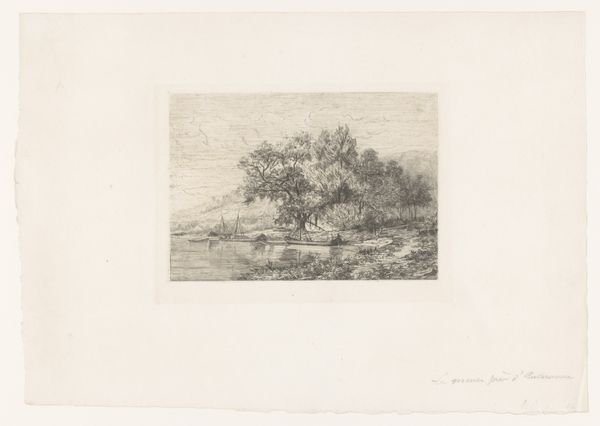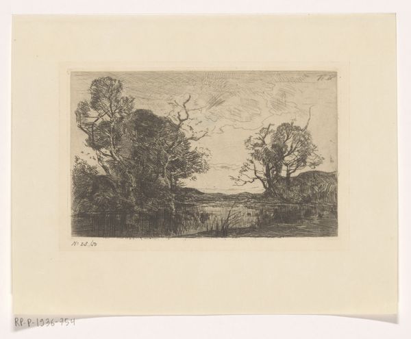 Christian Ludwig von Hagedorn created this rivierlandschap etching some time between 1722 and 1780. Hagedorn’s work, now held at the Rijksmuseum, gives us a glimpse into the artistic tastes of 18th-century Europe. He was the Director of the Academy of Arts in Dresden, so his work would reflect the academic preferences of the time. The image presents an idealized vision of nature, carefully composed and rendered with delicate lines. The picturesque scene, with its serene river and lush trees, speaks to a growing appreciation for the natural world, which coincides with the rise of landscape painting as a genre. The etching captures a moment of quiet contemplation and invites viewers to reflect on the beauty of the Dutch countryside. Art historians would consult period documents, letters, and institutional records to fully understand the piece's context and meaning. Appreciating art requires us to understand the social and institutional forces that shaped its creation and reception.