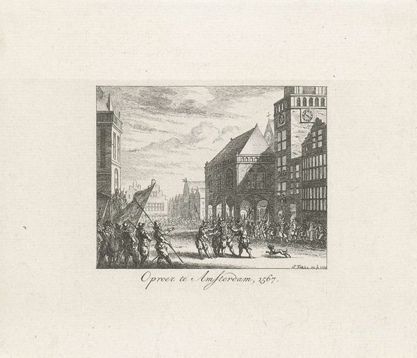 Simon Fokke created this print titled 'De Raad van State te Brussel in hechtenis genomen, 1576'. Although Fokke created this artwork in the 18th century, it depicts an event from 1576 during the Dutch Revolt. This revolt was a fight for independence from Spanish rule, deeply influenced by religious and political tensions. This print captures a pivotal moment: the arrest of the Council of State in Brussels. The figures in the foreground are being apprehended, surrounded by armed guards, while a crowd looks on. The Council represented a complex intersection of power, with members from different social strata. Their arrest symbolizes the struggle against oppression, but also hints at the internal conflicts within the Netherlands. How do issues of class and regional identity play out in the quest for national unity? The act of depicting this event over two centuries later suggests a continued resonance with themes of justice and self-determination. It encourages us to reflect on how historical events shape our understanding of power and identity.