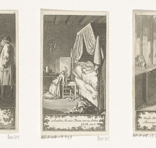 Editor: So, this print—"Feind spielt schaak met Herr Less" by Daniel Nikolaus Chodowiecki, from 1776—is currently held in the Rijksmuseum. It feels rather theatrical to me, almost staged, with that intense candlelight and those gathered figures. What story do you think it’s telling? Curator: Oh, this isn’t just any game of chess, is it? With those knowing glances and hidden meanings. I like to imagine the players aren’t just moving pieces across a board; they're shifting ideologies and testing social boundaries. And look at how Chodowiecki’s cross-hatching lends such gravitas. Does it suggest an evening fraught with tension or simply a display of intellectual gamesmanship? Editor: Gamesmanship definitely comes to mind! It's the 18th century, so could it also be about class or status? Curator: Indeed! Maybe they are playing a double game, veiled in the rules of chess but hinting at real-world power struggles. Consider, how does the physical closeness or distance between the characters at the board affect our reading? Editor: It’s as if their expressions are saying more than their moves. Curator: Precisely! Don’t you think Chodowiecki invites us into a secret world where everyday actions speak volumes? It’s like the artist is slyly saying, “Here’s how people really operate, concealed beneath polite surfaces.” The drama is really captivating. What would you call it? Narrative Baroque? Editor: That's very perceptive, combining history with personal stories in one game. Curator: That tension, you know, between appearance and what truly lies beneath. It gets me every time. Thanks for making me see it fresh.