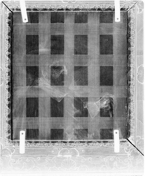 Curator: This is an x-radiograph of "Male Portrait" thought to be by Dieric Bouts. What strikes you most about this ghostly view? Editor: The grid. The way the portrait is overlaid with this precise, almost mathematical pattern really clashes with what I imagine to be a more organic, expressive painting style. Curator: It’s uncanny, isn’t it? Seeing this hidden structure. The x-ray reveals the wooden panel beneath the paint, the very bones of the piece. It changes our understanding. Editor: It also shifts our understanding of labor. Someone prepared that panel, planned the construction, and that's just as crucial to the artwork's story as Bouts' brushstrokes. Curator: Absolutely. I think it's a good reminder that so much of what we experience is layered with hidden histories, both artistic and material. Editor: Agreed. This image pulls back the curtain on the making of the art object, revealing something both ancient and strangely modern.