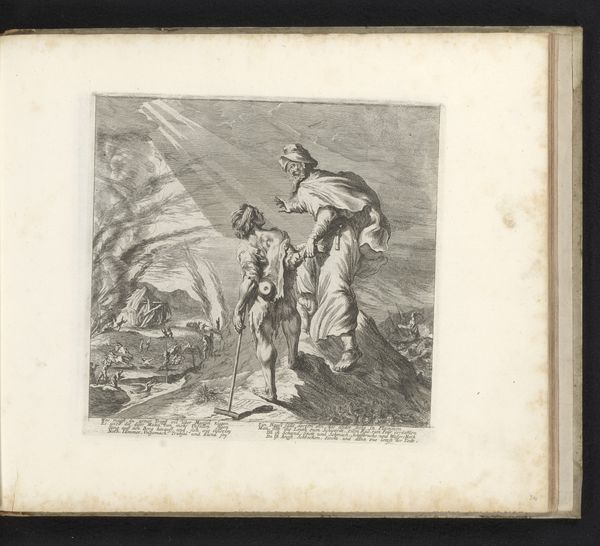Editor: Here we have Jacques Etienne Victor Arago's 1822 engraving, "Gevecht tussen twee krijgers van Ombay in Indonesië," housed in the Rijksmuseum. I'm struck by how the landscape almost disappears behind the drama of the two figures. It's stark, almost brutal. What draws your eye in this piece? Curator: Brutal is a good word! It sparks a strange feeling, doesn't it? This work pulls us into a romanticized version of "the exotic," typical of Orientalism. But behind that initial impression, I see Arago grappling with something deeper – a clash between cultures, perhaps even a projection of Europe's own internal conflicts onto this distant land. Notice the theatrical posing and the almost scientific detail in their weaponry and adornments. Does that pose any questions for you? Editor: It does make me wonder how accurate of a portrayal this really is, given the obvious romanticizing. It feels less like a document and more like a staged performance. Curator: Precisely! It dances between documentation and invention. And that tension, that awareness of the artist's hand shaping the narrative, is what makes it so compelling, even now. I keep asking myself what story Arago truly wanted to tell. Perhaps he didn't even know. Editor: So it's less about what is depicted, and more about the "why" it's depicted? Curator: Exactly! We're glimpsing not just a scene, but a mindset. And perhaps, even a reflection of ourselves. Editor: That makes me look at it in a completely new way. Thank you! Curator: My pleasure! That's what good art should do, shouldn't it? Provoke a little reflection.