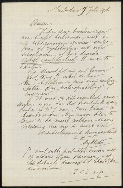 This is a letter, penned in 1890 by Willem Kloos to Jan Veth. It offers us a glimpse into the literary and artistic circles of the Netherlands at the time. Kloos, a leading figure of the Tachtigers, a Dutch literary movement that rejected naturalism in favour of aestheticism and individualism, is writing to Veth, an artist, critic, and fellow intellectual. Their correspondence reveals the close-knit community of artists and writers who shaped the cultural landscape of the era. The Tachtigers sought to elevate art above social and political concerns, emphasizing subjective experience and beauty. Yet, by examining their letters, manifestos, and publications, we can understand how their ideas both reflected and challenged the social norms of their time. Understanding this letter requires a careful reading of the historical context, looking into the archives of literary journals and biographical accounts. In doing so, we can gain a deeper appreciation of the complex interplay between art, culture, and society.