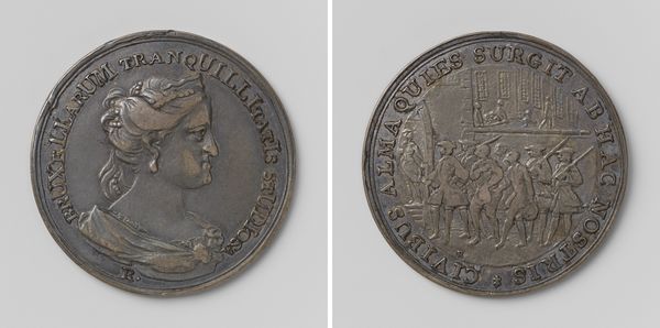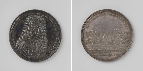 Curator: Look at this! It's a bronze medal, “Verovering van Temesvar,” created by Philippe Roettiers in 1716. One side features a profile of Charles VI and on the other, the depiction of the siege itself. Editor: My first thought? This could easily be mistaken for something far older. There's a muted solemnity, a density, that gives it an aura beyond its mere age. The patina really enhances that feeling. Curator: Absolutely. It speaks to the baroque sensibility; a grand commemorative gesture. These medals were very popular then – portable propaganda almost, celebrating victories. The text surrounding the portrait labels Charles VI, Holy Roman Emperor, whilst the opposite side is an ode in Latin. “The enemy yields to the victorious arms of Charles." All in neat concentric circles. Editor: Yes, portable propaganda! But I think that's reductive. To contextualize this piece, one needs to understand Temesvár, a strategically vital city which was under Ottoman rule for nearly two centuries before Charles' victory in 1716. So the medal does much more than just proclaim a conquest, it signifies the shifting power dynamics of early 18th century Europe. Curator: Very true. It's a snapshot of a very particular moment in geopolitics rendered permanent in bronze. Also, I always marvel at the skill involved; such tiny detail worked into a small space. Editor: The ability to inscribe so much narrative and historical weight into such a small object is certainly an exercise in mastery, and worth contemplation from today's perspectives. How are we still shaping objects to tell our stories? What power dynamics are embedded in our contemporary "keepsakes?" Curator: That gives me pause! Seeing this makes me feel connected, and somehow small, knowing events and individuals, now simply recorded like this, echo across so many centuries. Editor: And yet these echoes shape who we are today; examining such works critically illuminates so much about the past, and the present. It forces us to engage with the legacies we have inherited, both celebratory and fraught.