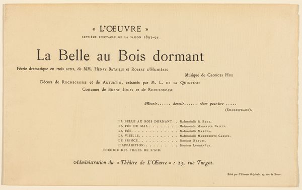 Curator: Looking at this intimate mixed-media print on paper, one feels a palpable sense of quiet grief. Editor: Indeed. This is "Overlijdensbericht aan Philip Zilcken," a death announcement dating from after 1913. The text is entirely in French and announces the passing of Madame Félix Buhot, née Henrietta Johnston, to Monsieur Jean Buhot. It communicates this painful loss to acquaintances. I can delve into the history of death announcements if you would like. Curator: It’s powerful how a seemingly simple piece of typography can evoke so much. But looking beyond its immediate melancholic effect, the class is quite evident. There's a formality implied in announcing deaths this way, signaling bourgeois societal customs that dictate not just mourning but public demonstrations of mourning within tightly regulated societal spaces. I think a deep study into such materials can unlock key understandings of the era's performative sadness and its relationship to status. Editor: Precisely. These announcements were not just personal expressions; they were carefully constructed performances adhering to specific social codes and expectations, often linked to religious practices. Consider, for example, how the text explicitly mentions that religious services were celebrated at the Saint-Georges Anglican Church before the burial. The family is highlighting their position within Parisian society by referencing particular churches. Furthermore, the printer's information – G. Trouvain, a Parisian firm – underscores that the family circulated within a very particular local milieu. Curator: Absolutely, and I can’t help but see a potential reflection on evolving ideas of gender and lineage. The announcement places considerable importance on Henrietta Johnston’s maiden name, underscoring the matrilineal dimension of identity – it brings to mind debates in feminist studies regarding how women's identities are perceived across historical landscapes. Did Johnston retain ties to specific networks connected through her maiden name? This sort of ephemera is so revealing of how familial relations were negotiated publicly. Editor: I agree entirely. And if we also consider that the intended recipient was a man—Monsieur Jean Buhot—this opens further avenues for interpretation related to inherited name, patriarchal lines, and public visibility for male familial figures in early 20th-century Parisian society. Curator: A small piece of paper holding entire social universes within its fibers! Editor: Yes, a modest artifact opening boundless doors for deeper understanding.