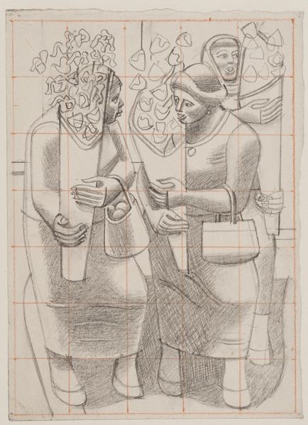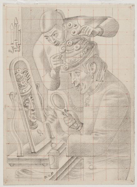 Editor: Here we have William Roberts’ study for the cover of ‘A Vorticist at the Hotel de la Tour Eiffel’. It's a pencil drawing on graph paper, giving it this very precise, almost industrial feel. What strikes you most about this preparatory work? Curator: The graph paper is key, isn't it? Roberts is literally mapping out the material production of culture. This isn't some spontaneous creation; it's constructed, piece by piece, mimicking industrial design. Notice the figures rendered almost as cogs in a machine, consuming and being consumed by the processes of modern life. Editor: So, you see the grid as representing societal structures? Curator: Precisely! It challenges the romantic notion of the artist as a singular genius, highlighting the social and material conditions that shape artistic output. The act of sketching on this paper underscores how even avant-garde movements like Vorticism were embedded in, and commenting on, the industrialized world. Editor: That's a very interesting perspective, I didn't think about that! Thank you!