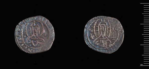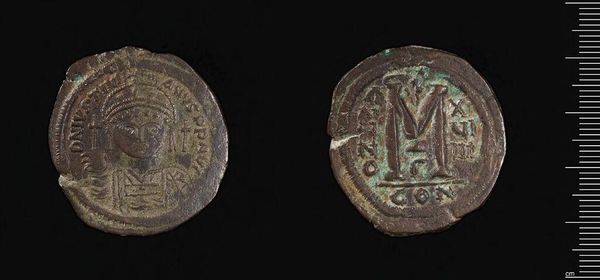 Editor: Here we have the Coin of Phokas, from Harvard Art Museums. It's a small, dense object. Given the context of the period, what does this coin tell us about the culture that produced it? Curator: The coin’s weight and metallic composition reflect the economic stability, or lack thereof, during Phokas’ reign. The images, seemingly stamped, demonstrate the standardization of iconography for wide distribution. The very act of producing these coins, and their subsequent circulation, illustrates a complex system of labor and trade. How does this compare to modern currency production? Editor: That's a great point. I hadn't considered the labor aspect. It provides such a different lens for understanding value. Curator: Exactly. Considering the coin as an object produced, circulated, and ultimately consumed, reveals a lot about the society from which it originated.