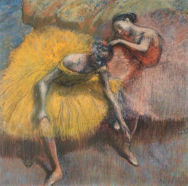 Curator: Here we have Edgar Degas’s “Dancer Putting on Her Slipper,” a pastel drawing created around 1896. Editor: It’s dreamy! I see this quiet, personal moment of preparation… sort of caught on the fly. I feel like I’m peeking. Curator: That's interesting, given the male gaze in ballet, historically. This artwork encapsulates Degas's fascination with ballet dancers, not just onstage but also behind the scenes, capturing them in moments of vulnerability and effort. Editor: There’s a lot of labor implied, right? That position doesn't look particularly comfortable to try and secure that shoe. It looks so informal… not at all glamorous. Curator: Exactly. Degas sought to portray the reality of these dancers, challenging romanticized notions. The artwork offers a glimpse into their physical exertion and dedication. It's also worth noting that dancers' bodies are policed from a very young age. How does that manifest in a picture like this one? Editor: Hmmm… well, maybe in the awkward angles and off-balance position. There’s a palpable sense of discomfort that cuts against any expected elegance. Degas doesn't give us idealized perfection. Curator: Indeed, there are socio-political implications concerning class, gender, and labor at play, considering the lives of many young dancers. This drawing prompts us to consider the complexities of their position in late 19th-century Parisian society. Editor: I like how the pastel almost blurs everything; it emphasizes this transient moment. Her body kind of dissolves into her skirt, blending into the backstage ether. Curator: A fleeting moment indeed—ephemeral, yet loaded with sociohistorical context. Editor: Ultimately, Degas creates a space for the dancers. And that, to me, adds humanity.