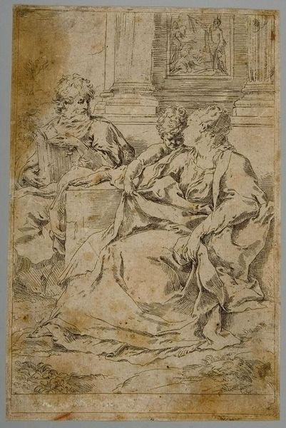 Curator: This is Guido Reni’s, Holy Family with Saint John, currently held here at the Harvard Art Museums. Editor: The lines are so active, almost frantic. It gives a real sense of movement, even though it's a static scene. What material is it? Curator: It's an etching. Reni was quite celebrated for his prints, which allowed for wider dissemination of his idealized forms. Editor: Dissemination is right. Look at the labor involved in creating the plate, the printing process… It's a reproduction, a commodity from the start, making the holy family accessible to a broader audience. Curator: Indeed. And consider the performative piety inherent in owning and displaying such an image. Editor: It’s a tangible object embedding cultural capital and reinforcing class structures. Quite the material investment, spiritually and economically. Curator: A fascinating interplay of devotion and social status, wouldn't you agree?