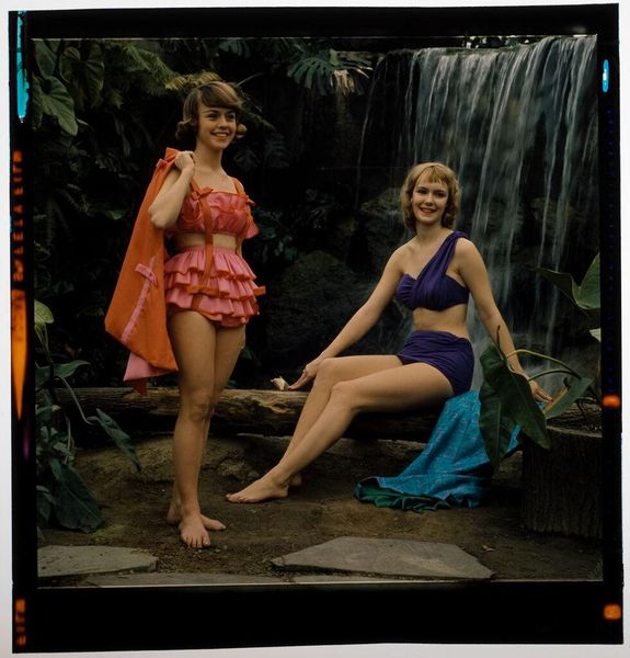 Curator: This is an untitled photograph by Jack Gould, held in the Harvard Art Museums. The model's swimsuit and the indoor rainforest create such an interesting juxtaposition of artifice and nature. Editor: It's unexpectedly whimsical! I find the artifice quite dominant. The setting feels less like a rainforest and more like a constructed backdrop. Curator: Exactly! The construction is key, isn't it? The materials of the hat, the swimsuit's fabrication... they all point to specific modes of production and consumption. And what is the labor involved in manufacturing it all? Editor: I agree. The entire composition seems to question the role of commercial imagery and its influence on our perceptions of luxury and nature. Perhaps it is a comment on constructed realities for the masses. Curator: The image really highlights how socially and historically loaded seemingly simple materials can be. Editor: Indeed. It prompts you to think about fashion photography's impact on public perception, its commercial roots, and the way it shapes our cultural values.