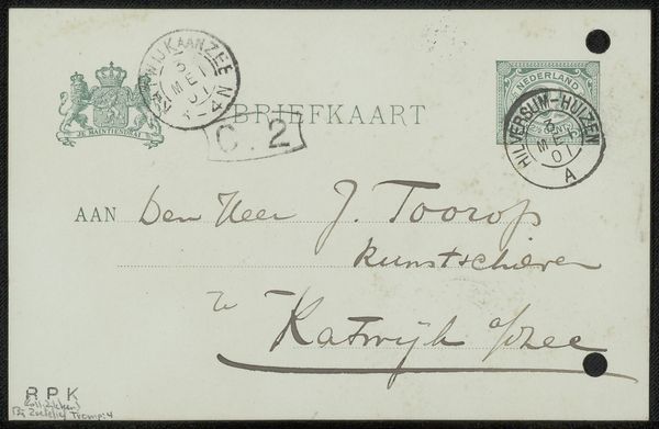 Curator: Here we have Jan Zoetelief Tromp's "Briefkaart aan Willem Leuring," created before 1927, rendered in pen and ink. It seems quite small, a glimpse into an everyday exchange. Editor: Yes, the intimate scale gives it a personal, almost secretive quality. There's an undeniable nostalgia evoked by the faded ink and delicate script. But look beyond the surface, and it hints at something deeper. Curator: I’m drawn to the hand-lettering; the texture, and how the artist experimented with the density of the ink. The very act of Tromp's creation–the materiality of the paper, pen, and ink – speaks volumes about artistic practice at the time. We see the residue of his labor, quite literally. Editor: Absolutely. But consider, too, that postcards like these weren’t just simple mail. They served a socio-political function. The messages, even the seemingly mundane, played a part in the shaping of identities, in this case probably between Tromp and a Dr. Leuring in the Hague. Who was Willem Leuring? And what position did he occupy in society? How does that position of sender and recipient influence the message itself? Curator: Intriguing questions. And Tromp certainly wouldn't be mass-producing these. Each postcard, then, is almost a miniature, handcrafted artifact representing a unique exchange. The stamps, the postmarks, all material evidence of transit and handling—a unique process of moving through a system. Editor: The fact that he, an artist, took the time to design his address is interesting. Perhaps even making his status in Dutch society by creating this design. Plus, that this survives signals that it wasn’t simply disposable—it has meaning and speaks to its legacy within LGBTQ+ and art communities alike. Curator: Indeed, a survival through changing values and practices over a century is a statement on its own material presence. This fragile object tells a story not only about Tromp but about artistic production, about labor and skill, at a pivotal time. Editor: Agreed. It's a poignant reminder of the complex relationships embedded within seemingly simple everyday objects—connections between individuals, and connections between the art object and larger societal structures of identity and class.