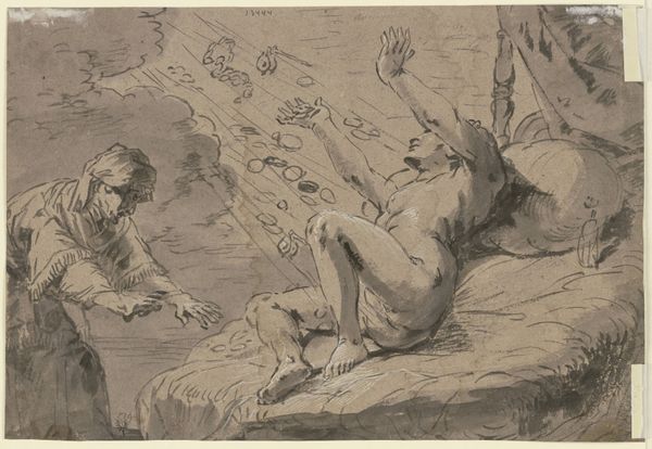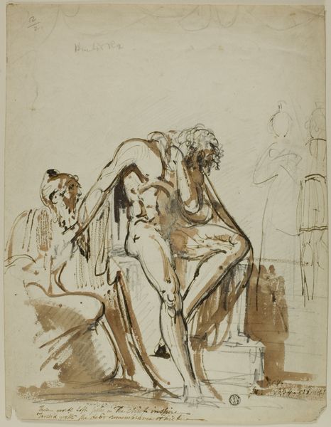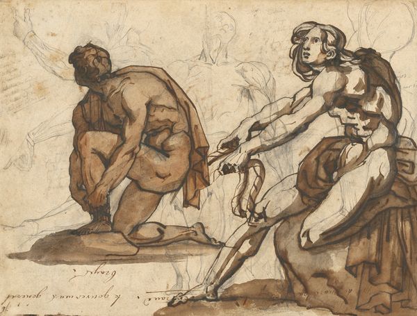 Curator: Oh, my! Look at this wash drawing! It just speaks of vulnerability and noble sacrifice. Editor: Indeed. This work by Nicolai Abildgaard, created between 1743 and 1809, is titled, "Den atheniensiske konge Kodros forlader sit hjem for ukendt at vandre mod fjenderne, til venstre hans kone og søn" – "The Athenian King Kodros Leaves his Home to Wander Unknown Towards the Enemy, his Wife and Son on the Left." It is currently held at the SMK, the National Gallery of Denmark. We see a figure in watercolor and pencil. The bare feet, the sparse possessions... this isn’t just sacrifice, it’s deliberate divestment. What do you sense here? Curator: An aching… yearning. It reminds me of saying goodbye, of choosing duty even when it splinters your very being. He goes willingly towards his end, not for glory, but to protect his own. What a poignant act of love. I get goosebumps! It’s all lines, the immediacy, and that warm sepia wash suggesting a sunset of life. Editor: Right! And consider the artistic economy at play. Look at the figure walking toward the unknown, all essentials bundled on his back, the tools necessary for this sacrifice. Think about the scarcity implied in these choices of rendering with simple materials, reflecting the lean necessities of war itself and also pointing to his agency within the creative labor behind artmaking. It wasn't oil painting on canvas—no! Abildgaard opted for humbler stuff. Why? Curator: Perhaps because the starkness amplifies the human cost. No grandiosity to soften the blow. It’s immediate, raw, visceral, hitting right in the gut. Editor: Exactly. By choosing this process and by making his statement like this, he brings us face-to-face with essential human decisions made for survival that resonate well beyond classical antiquity. The man on the way and his family there: a snapshot into human vulnerability but told using few resources. Curator: It makes you think. It almost feels wrong to analyze it. Editor: Maybe… but the more you contemplate how art like this speaks of humanity and the value in hard and smart material choices, it allows the message and emotions to live well past the moment of creation.