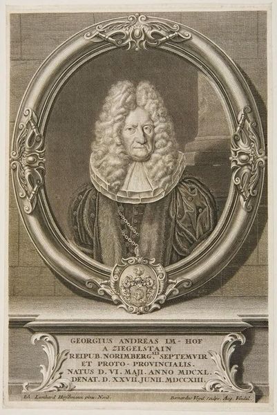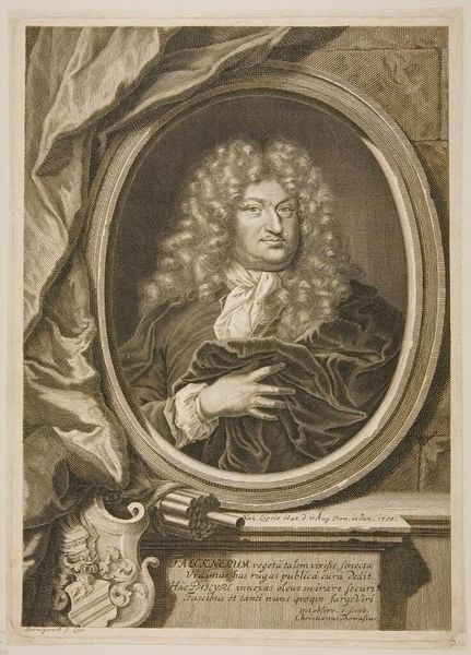 Curator: Here we have Joseph Anton Zimmermann’s rendering of Joseph Clement of Bavaria, Elector Archbishop of Cologne. The print work is so fine; it's like staring into a mirror from centuries ago. Editor: It's a fascinating study in power and representation. Look at the elaborate wig, the ermine-trimmed cape, the subtle glint of metal on the book behind him...it’s all crafted to convey authority. Curator: Right? But also, there's this palpable sense of someone deeply entrenched in the structures, yet yearning for something beyond. I feel that in his eyes. Editor: I see it as a document of its time. An era where religious and political power was intertwined. Joseph Clement embodied that nexus. Curator: And Zimmermann captured that in such a way that makes you feel like you are there, in that moment, in that very same room. Editor: It's more than just a portrait; it's a cultural artifact, reflecting the intricate dance between identity and social role. Curator: It’s an echo, really, a whisper of a world long past. Editor: Yes, and like all good echoes, it invites us to consider our present.