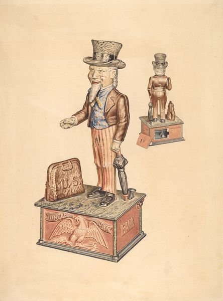 Editor: This is Raymond Neumann's drawing "Cigar Store Figure: 'Punch'," created sometime between 1935 and 1942. It's quite a character study of this vintage advertisement figure! The little wheeled platform stating 'On the Job Since 1865' gives it an extra layer of context. What can you tell us about its historical relevance? Curator: This image invites us to consider the broader cultural landscape of commercialism and representation in America. The 'Punch' figure, rooted in Punch and Judy shows which go back to the 16th century, was widely used to attract customers to cigar stores. This drawing captures a specific iteration, and by extension, points to a much longer history of using caricatures to entice a demographic. Consider, for instance, the social implications tied to such representations in the interwar period and later. Editor: That makes sense. It feels almost like a commentary on consumer culture. Do you think Neumann's intention was purely representational or more critical? Curator: That’s a tricky question. Artists, including commercial artists, rarely operate in a vacuum. They were certainly aware of the figures they were selling and also of the wider societal conversations of race, immigration, and stereotypes. How does the piece speak to the American fascination with commerce, as well as the role these caricatures played in forming cultural perceptions? Does the date on the figure’s stand – “Since 1865" – hint at a romanticized past, and if so, what does this signal in relation to consumerism at the time this image was created? Editor: That is definitely food for thought, particularly in considering the legacy of advertising, and its place in our cultural history. I hadn’t considered the date’s relevance so deeply! Thanks. Curator: Absolutely. The artwork acts as a social and cultural mirror of the past. By thinking about advertising, and its imagery, we can consider not only historical norms, but question what and how that impacts today.