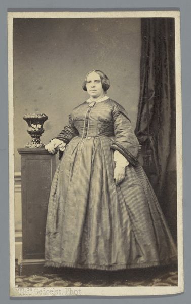 This is a studio portrait of an older woman in a long black dress by Ghémar Frères. The photograph, with its muted sepia tones, presents a study in contrasts and textures. The woman's dark dress dominates the composition, its heavy fabric creating a voluminous form that anchors her to the ground. Note how the subtle interplay of light and shadow models the folds and curves of the dress, adding depth to an otherwise flat surface. The white collar and cuffs offer a crisp counterpoint, drawing the eye towards the sitter's face and hands. Consider how the portrait engages with notions of representation and identity. The woman's direct gaze and formal attire suggest a desire for respectability and social status. At the same time, the subdued palette and restrained composition evoke a sense of melancholy and introspection. It invites us to contemplate the complexities of human experience.