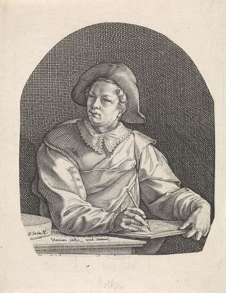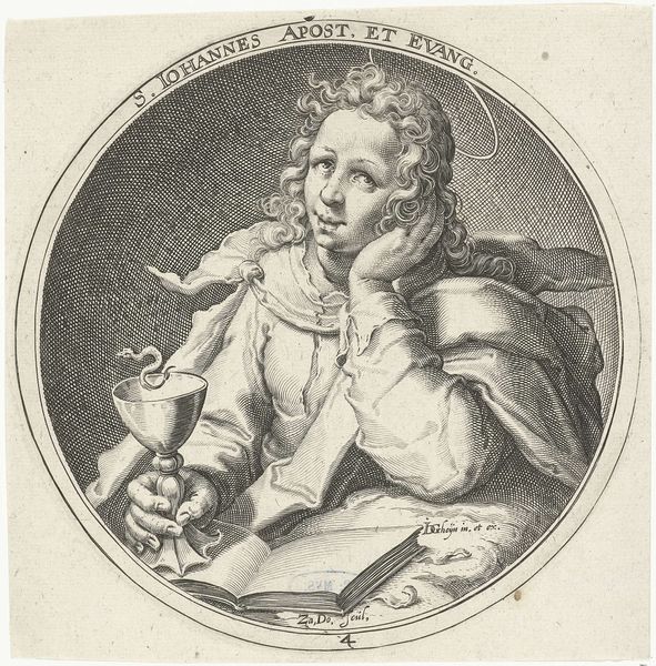 Curator: Zacharias Dolendo's "Saint John" has this striking circular composition. The sheet measures about 15.5 x 15.1 cm and resides at the Harvard Art Museums. Editor: It feels like a quiet moment of reflection. He's almost daydreaming, isn't he? Sort of youthful melancholy about it. Curator: Indeed, the engraving's textures create a contemplative atmosphere. The chalice and serpent are rather compelling symbols, don't you think? Editor: Totally. The contrast is fantastic. That snake in the cup is intense and intriguing. I almost want to write a poem about it. Curator: The image invites contemplation about faith. Ultimately, it’s a testament to Dolendo's skill in capturing subtle emotion. Editor: Absolutely. This little Saint John really gets under your skin. It's nice to sit here thinking about this piece.