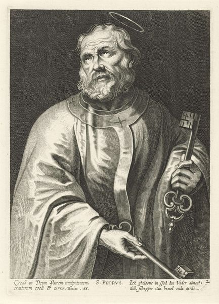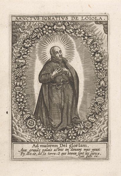 Curator: Let's talk about "Philippus Neri", an engraving from around 1678 to 1694 by Richard Collin. Editor: It has a devotional, pious air. I'm struck by the upward gaze and the clasped hands, which immediately set a tone of humility. Curator: The artistic choices clearly promote Neri's sainthood, portraying him within a radiating halo in the classic Baroque style, which often depicted religious figures with heightened emotion and drama to inspire piety in viewers. How might social conditions and institutional religious patronage inform our view? Editor: It's impossible to separate the creation of this image from the Catholic Church's efforts to maintain influence through the dissemination of pious imagery. Prints such as these, and by implication "Philippus Neri" helped cement ideas about how individuals of faith are expected to perform it. What narratives might the piece offer about social justice or challenge it? Curator: Well, this depiction presents a somewhat sanitized vision of sainthood, absent of social context and intersectional perspectives of who achieves sainthood or why. While there is undeniable artistry here, the work also glosses over complexities regarding Neri's personal life and societal implications that are typically promoted, so we must consider what stories may have been repressed, and what impact this may have had. Editor: Indeed, what this image leaves out is as significant as what it includes. Collin’s print presents not just the saint but how a population were socially engineered to imagine a very idealized and gendered expression of faith, and it continues today, so even now its messages and themes affect those. Curator: These observations emphasize the ongoing resonance of art to influence and reflect larger political and social movements. The image’s history illuminates how the power structures are woven into artistic representation, from religious authority to gender stereotypes. Editor: Exactly, understanding how that history shapes both production and interpretation gives it even more contemporary relevance, showing art's lasting relationship to social power, identity and change.