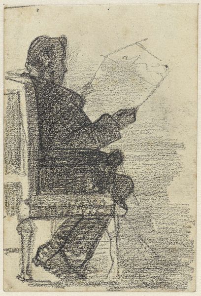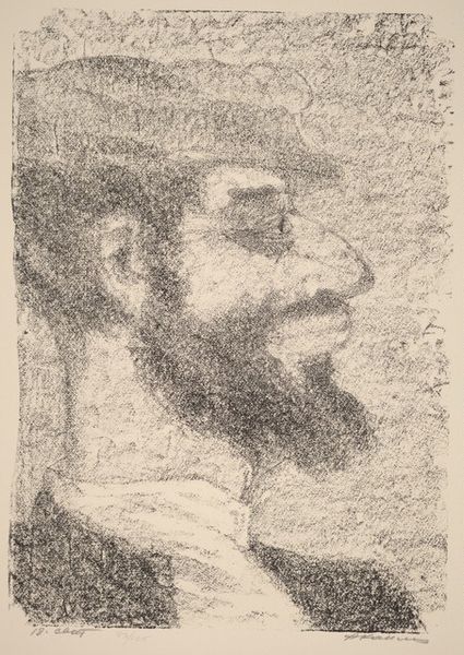This is Anatoli Kaplan's lithograph "Luftmensch." The figure emerges from a textured background, its form built from dense, granular marks in varying shades of black and grey. This technique gives the subject a sense of depth, yet also a spectral quality, as if the figure is simultaneously present and dissolving into the ether. Kaplan's focus on materiality is evident in the way he uses the lithographic stone. The rough texture evokes a feeling of gravity, which is interesting, given that Luftmensch is Yiddish for "air person", someone detached from practical concerns, perhaps even a dreamer. This contrast between the subject and the execution is intriguing. It invites us to think about how identity is constructed through form, and how an artwork can embody internal tensions. The density of the marks works against the lightness implied by the title, and the figure seems weighted by the very material that gives it form.