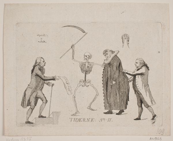Curator: This is "Kiøbenhavns Skilderie". Nr. 2, an etching made in 1787 by J.F. Clemens, now housed here at the SMK. Editor: It's wonderfully odd, isn't it? Like a scientific diagram crossed with a satire. The clear lines of the etching and the way the light focuses the image are interesting. Curator: Absolutely. It's tempting to consider the etching in light of social and cultural contexts, specifically through the lens of eighteenth-century entertainment. Public perception often reduces those in that era to aristocrats. Is this work pushing back on those perceptions? Is there something radical at play here? Editor: What interests me most is how Clemens is actually *making* meaning, not just what he represents. Think about the production process—etching, printing. It’s a technology designed to make multiples, distributing this little drama to a wider audience than a unique painting could reach. Curator: And a very particular audience, right? This print addresses the material realities, such as social and gender issues in relation to labor as a performative exercise? Editor: Exactly. Also, note how this connects to the performance depicted. One figure works this machine—essentially the projectionist or engineer—while the other figures perform, trapped and silhouetted inside that circle. This has something critical to say about the economics of seeing in Denmark during the late eighteenth-century, too, wouldn’t you agree? Curator: I do. When assessing, remember, gender and power also take center stage. Considering their roles in both production and viewership within eighteenth-century Copenhagen opens further interpretations of who wields agency and how visual narratives bolster societal norms, gender roles, and perhaps, gender-based expectations within Copenhagen at the time. Editor: Thinking about the labor that goes into the circulation, what are people going to do with these things? Are they pinning them on walls? Trading them? Studying the latest in technological novelties, in shadow play techniques? Curator: The performative gesture—these types of drawings may serve as commentary of daily activities; Clemens' decision to position people in the drawing may lead us to reflect on power dynamics. In light of class hierarchies of the era, do we see echoes of colonial control enacted in everyday exchanges, the play between seeing and seen? Editor: And the starkness of the etched line really emphasizes the performative nature of labor in an era undergoing massive changes from cottage industries to increasingly consolidated manufactures. Food for thought. Curator: It truly is. A testament to how artworks resonate across time, allowing continued questioning. Editor: A print that continues to yield new meanings depending on where we place our focus.