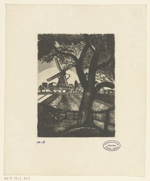 Curator: This is "Rising or Setting Sun" by Lodewijk Schelfhout, made in 1918. It’s a linocut print currently held at the Rijksmuseum. Editor: It's a powerful image. The high contrast and dense lines give it an almost oppressive, melancholic feel. Curator: Indeed. The use of linocut here is fascinating; a relatively accessible medium, chosen by Schelfhout to depict a traditional landscape scene. It suggests a democratizing impulse, to make art and its themes readily available. Editor: I agree. Considering it's 1918, the end of the First World War is relevant. That stark contrast—the harsh black and white—resonates with the emotional landscape of that era, reflecting loss, uncertainty, and the questioning of established social orders. Even windmills look ominous. Curator: Precisely. Schelfhout's choice to create this piece as a print indicates a desire for wider dissemination, making a potent visual statement available to a broader audience rather than being confined to a single canvas for an elite collector. There is also a very modern division in its materiality—look at how those flat expanses contrast with dense hatching. Editor: Also, think about the deliberate construction of the image: the sun, or rather its silhouette, as a focal point, dominating a scene of rural life. But are we actually looking at a rising or a setting sun? A birth of hope, or an end of an era? This ambiguity seems intentional, asking us to grapple with these themes, as society did after WW1. Curator: A compelling thought. By employing a method often associated with craft and using stark linework, Schelfhout challenges hierarchies and asks viewers to examine their relationship with both art production and the rural Dutch landscape he presents. Editor: Right. This image, through its production and stark symbolism, speaks to a historical context, but its emotional core around loss and possible rebirth remains relevant even today. It reminds me of similar works of Käthe Kollwitz; it shares some interesting, somber tones, both materially and symbolically. Curator: Looking closer at "Rising or Setting Sun", we can better appreciate how it encourages us to see the artist's world, his methods, and maybe also our own lives through a powerful blend of image and substance. Editor: Exactly, a simple print can prompt contemplation, extending from the means of production all the way through socio-political reflections about a very difficult time.