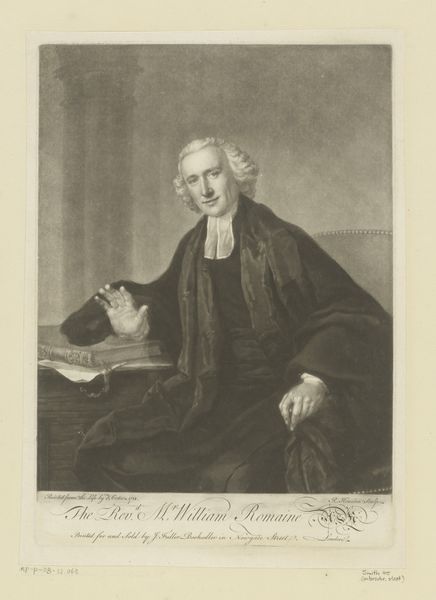 William Pether created this mezzotint portrait of Samuel Chandler in 18th century England. As a visual code, we see the trappings of Chandler's success as a dissenting minister - the books, the writing desk, and his clerical robes. This image speaks to the rising social status of nonconformist religious figures during this period. Chandler's intellectual labor is emphasized, perhaps to counter stereotypes about dissenting beliefs. Pether's choice of mezzotint, a tonal process, lends the image a certain gravitas. The soft gradations of light and shadow add depth to Chandler's character, inviting viewers to see him as a learned and thoughtful individual. Understanding this artwork means delving into the religious and political history of 18th century England. Researching the biographies and publications of dissenting ministers like Chandler would help us to fully grasp the social dynamics at play in this compelling portrait.