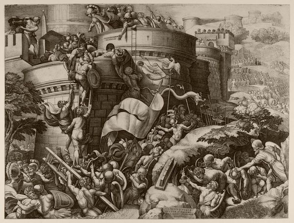 Editor: Gustave Doré's "The Crusaders' War Machinery," created in 1877, showcases incredible detail using printmaking techniques. The chaotic scene really evokes a sense of dread. How do you interpret the historical implications of this work, especially considering the context of its creation in the 19th century? Curator: This piece, made nearly 700 years after the Crusades, reflects a 19th-century fascination with and romanticization of the medieval period. Doré presents the Crusaders not just as warriors, but as engineers of destruction. It forces us to consider the historical narratives surrounding religious conflict, and how these are constructed. Are we celebrating ingenuity or condemning violence? Editor: I hadn't considered that the focus could be on the technology itself rather than solely on the battle. Does Doré’s choice of printmaking influence the meaning? Curator: Absolutely. The medium enables a sharp, almost clinical depiction of war, perhaps distancing the viewer emotionally while simultaneously emphasizing the mechanical and systematic nature of violence. It mirrors the industrialization of warfare, doesn't it? This connects the medieval past with modern anxieties. Where does religious zeal end, and the pursuit of technological dominance begin? Editor: It’s chilling to think about the parallels between medieval siege warfare and modern military technologies. Curator: It also challenges the usual heroic narratives, revealing a more complex, unsettling side of history and power. How might we apply this critical lens when examining depictions of conflict today? Editor: This really made me reconsider the role of historical context in understanding not only the artwork, but also the cultural anxieties reflected within it. Curator: And to reflect upon whose perspectives dominate historical representations. Food for thought, isn’t it?