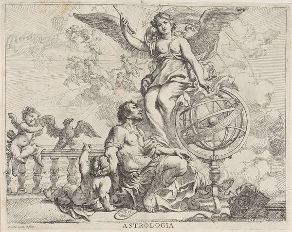 Curator: Here we have "Venus en Amor", an engraving crafted by Cornelis Bos in 1546, currently residing here at the Rijksmuseum. It's quite intricate, don't you think? Editor: Indeed, immediately I'm struck by its almost severe linearity. The cross-hatching creates this overall sense of depth and shadow but also flattens the space somewhat, containing the exuberance of the subject matter. Curator: Well, let's consider Venus, seated regally on her chariot. Notice how the putti are arranged. Some propel the vehicle while others accompany Amor who seems ready to inflict desire with his bow and arrow. This speaks volumes about the iconography associated with Venus and how she commands even the powerful cupid. Editor: I find it quite fascinating to look at Cupid in relationship to the doves—what stories of love or peace, perhaps betrayal, can we see whispered here, especially with the dove leading the others, staring at a different destiny! What tensions arise in this Mannerist allegory with its exaggerated musculature and elongated figures! Curator: Don't you agree it's representative of the Mannerist style in its departure from High Renaissance ideals of perfect balance? Note the artist’s concentration on refined detail and almost ornamental character to the human form, down to the complex rendering of the background with delicate horizontal lines. Editor: Right—Cornelis has composed an allegory with precise placement of objects and characters. As you mentioned earlier, the landscape serves not to provide background, but really, to push the drama forward. Consider that line Cupid seems to follow along; a stage of infinite love that perhaps continues forever with such repetition! Curator: Absolutely. Ultimately, the strength of this print resides not merely in its allegorical content, but in the highly disciplined graphic treatment; Cornelis used such clean lines! It emphasizes its themes in a tangible visual form, one designed to delight our viewers through artistic excellence as much as rich symbolism. Editor: I appreciate how analyzing it on its visual properties draws out many cultural associations, it almost feels as though the composition itself tells us so much, allowing for multiple interpretations of a timeless encounter between Love and Desire.