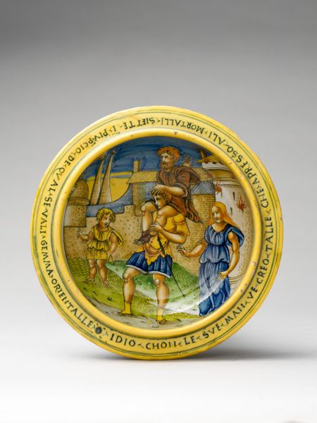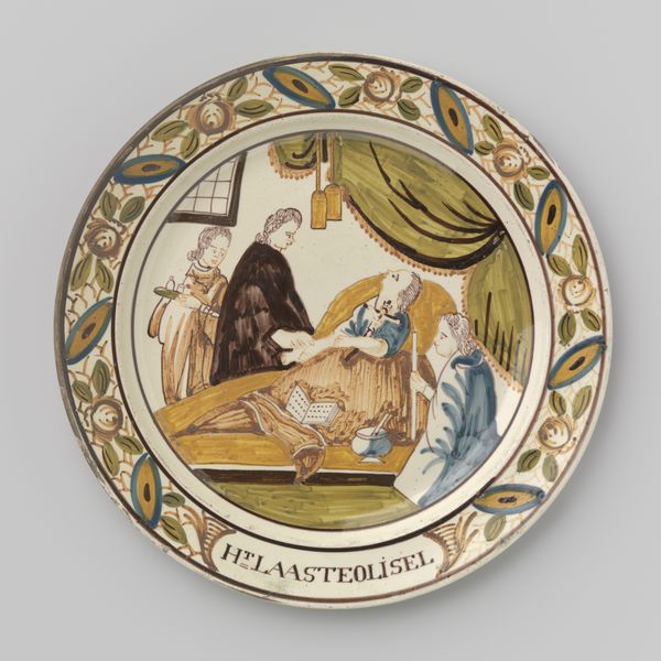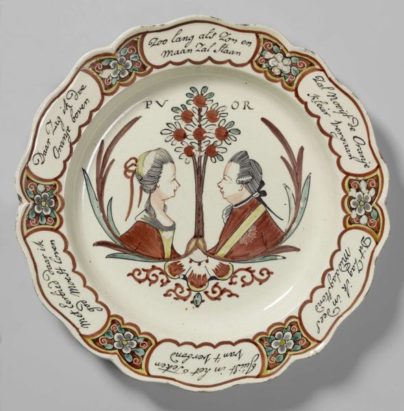 Editor: So, this creamware plate depicting a baptism scene, dating back to around 1800, it's really striking how narrative it is, and seeing that alongside a floral border is pretty unique. The plate is labelled "D:H: DOOP", what can you tell me about this image, with a cultural perspective? Curator: What leaps out immediately is the visual layering. We see the earthly act of baptism taking place, rendered with specific gestures and clothing, next to the crucifixion scene at the left. The Dove descending in a burst of light underscores this layering, connecting earthly action with divine will. Editor: So you are saying that there's two stories at play, that mirror each other through symbolism. How are we meant to read that visual relationship? Curator: Precisely. Ask yourself, what does baptism *mean* within that symbolic structure? The ritual purification in the water, is echoed and reinforced by the image of Christ's sacrifice, as purification through blood. These aren't just illustrations, but signifiers linking the individual to a long spiritual history. That dove, an ever-present symbol. Consider, where else have you encountered that image? Editor: It's so interesting how the imagery works on multiple levels. Thanks for pointing out the visual relationship between these religious figures and elements in one artwork. It does make you think about how continuity is embedded in even everyday objects. Curator: Exactly! It’s through understanding such symbolic vocabularies, how those elements appear time and again, across various cultures and time periods, that our cultural memory is constructed and maintained. We internalize that shared heritage.