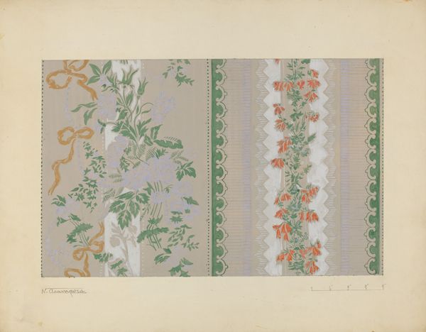 This printed textile was designed by Ralph M. Lewis sometime between 1855 and 1995. It seems to be printed on cotton, a material that became widely available thanks to industrialization. Looking closely, you can see the repeating patterns of floral designs alongside an almost wave-like striped motif, each carefully placed to create a visually appealing surface. It would be interesting to know what kind of printing process was used to create this textile. The regularity of the pattern suggests a mechanized process, perhaps involving engraved rollers or screens. This would allow for mass production, reflecting the rise of consumer culture and the availability of affordable textiles for home decoration. The choice of floral patterns speaks to a desire for beauty and ornamentation, while the mechanized production hints at the labor and industrial processes behind its creation. By considering its materiality and production, we gain a deeper understanding of the cultural and economic forces that shaped this seemingly simple printed textile, blurring the lines between craft, design, and industry.