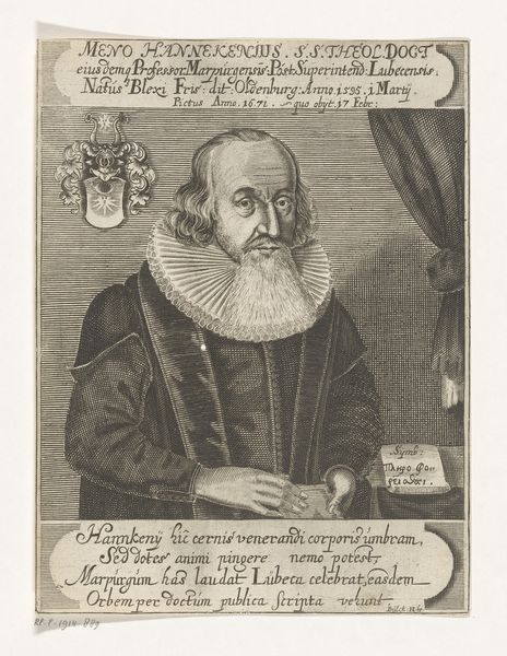 Editor: Here we have a Baroque portrait of Johann Jakob Pömer, made between 1641 and 1665, through an engraving technique. He looks stern, powerful. It's interesting how detailed the engraver made the ruff. What strikes you most about the image? Curator: The visual weight carried by symbols here speaks volumes. Consider the oval frame; it’s not merely decorative. Note the small cartouches above and below the portrait itself. Each contains unique emblems. The figure on top looks classical, and is labelled "IN MEE PETAS," which speaks to both humility and authority of a certain kind. Have you noticed what appears below? Editor: Yes! There is the family crest on the bottom. All seem like a symbolic armor surrounding Pömer, defining his identity...almost a kind of heraldic protection. Curator: Precisely! Think of these emblems and heraldry, which represent the convergence of family lineage, profession, and personal virtues. How does that combination translate to modern portraiture today? Editor: Well, perhaps the status symbols have shifted - a certain kind of clothing or expensive car to show wealth? But now I see these historical markers of identity so explicitly laid out! What do you think an audience at the time would have gleaned from these emblems, things we might overlook today? Curator: Perhaps in its time, viewers would see these images as containers of very specific familial and societal memory – a reminder of their own place within that world. The Baroque aesthetic lends to an age deeply concerned with status and the construction of image, wouldn't you agree? Editor: Definitely. It's amazing how an image, carefully constructed with symbols, can act as a time capsule of values. Curator: Indeed. Looking deeper, beyond the immediately visible, lets us retrieve and reimagine lost cultural languages.