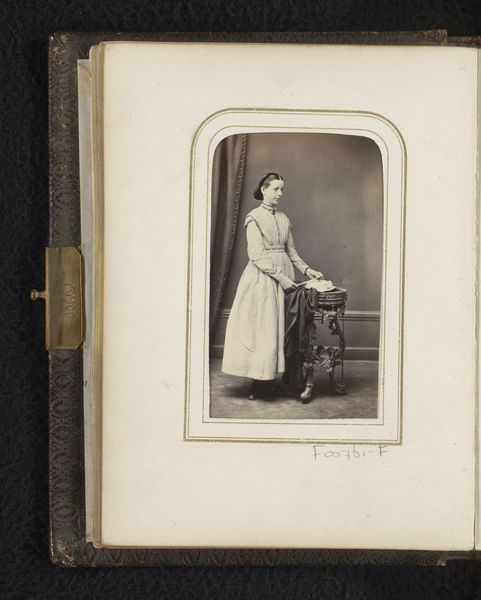 Curator: There’s something inherently melancholic about this piece, wouldn't you say? It reminds me of quiet rooms and forgotten histories. Editor: This is an albumen print, probably dating from around 1867 to 1880, titled "Portret van een dienstbode met witte muts, met lepel in de hand"–or "Portrait of a maid with white cap, holding a spoon." Curator: Oh, it's a photograph. It felt much older than that to me; a still life painted in a minor key, and holding a spoon as she poses. Editor: It certainly captures a very particular moment. These photographs were becoming more accessible then, yet they also present labor so formally. She's framed, not just by the photographic frame, but also within a larger social structure. Her very pose speaks to the expectations and limitations of her role, wouldn't you agree? Curator: Absolutely! She’s caught in a ritual, even. The lighting is almost dreamlike but practical implements of labor seem caught in amber. It is like seeing work made suddenly monumental in small things. You could almost hear a clock ticking there! I get an idea of quiet resistance or perhaps weary dignity from her expression. It makes one wonder what stories she's holding. Editor: It's fascinating to consider the mass production aspect, too. Albumen prints involved coating paper with egg whites to create a glossy surface that the photographer can create an image on and each print would need time-consuming manual labor from women as well. We should consider these photographic studios too, what sort of labor did they represent. How do we view an artwork like this with that kind of social labor embedded? Curator: True. Even though she's captured, she isn't necessarily contained. What could such work even communicate to viewers then as opposed to what can happen in our own moment. I think there is some possibility that eludes the lens—and me too, in this present time. The longer you look the more it resonates. Editor: Yes, an invitation to truly "see". Curator: Indeed! And that invites a deeper appreciation to both how we lived and worked.