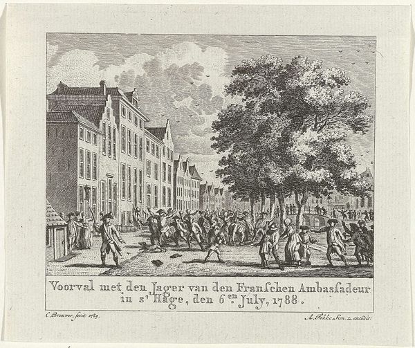 Curator: What a striking piece of historical commentary. This engraving by Theodoor Koning, titled "Incident met de jager van de Franse ambassadeur, 1788," really captures a moment of social unrest in The Hague. It was created between 1788 and 1789. Editor: The immediacy is captivating, isn't it? The dense cross-hatching of the engraving gives the scene such a palpable sense of tension and frenetic energy, you can almost hear the clamor. The material reality of this piece – the metal plate, the etching process – really emphasizes the way information was circulated in the pre-digital age. Curator: Exactly. Contextually, it's fascinating. This scene likely depicts an actual incident involving the French ambassador's huntsman and local citizens. Remember that the Dutch Republic was experiencing considerable internal political turmoil at this time. There's a clear clash between perceived foreign authority and the burgeoning Patriot movement pushing for more democratic governance. Note the use of Neoclassical ideals in rendering the city in the background. Editor: Yes, and thinking about Koning's process, engraving allowed for mass production and distribution of these images, turning events into powerful pieces of propaganda or, at the very least, shaping public opinion. This small, easily reproducible format is central to its socio-political impact. Also, I can't help but look at the cobblestones – consider the material from which the city's streets are formed – quarried from the earth. Curator: Precisely. It's fascinating to consider how a single, relatively minor incident could be amplified into a symbol of broader anxieties about power and national identity. The print’s very existence is tied to political ideologies. We should note how it speaks to anti-aristocratic sentiments present at that historical moment. The artist emphasizes specific details, and these highlight how perceptions were manipulated through such visual media. Editor: Absolutely. It all underscores how material culture intertwines with political narratives and shapes the way society consumed the daily news through objects, the role and accessibility afforded by print technology in this period. Thank you for enriching my reading of this piece by thinking with history in mind! Curator: My pleasure! It just reminds us how every artistic act, no matter how small, resonates with broader historical and social power relations. This visual artefact and record has truly allowed us insight into our political history.