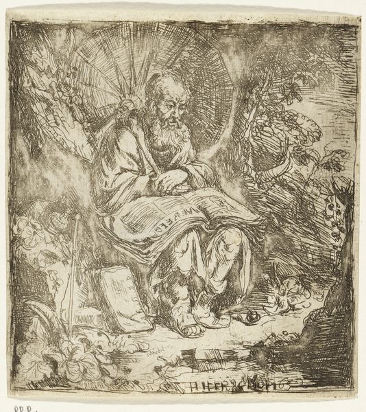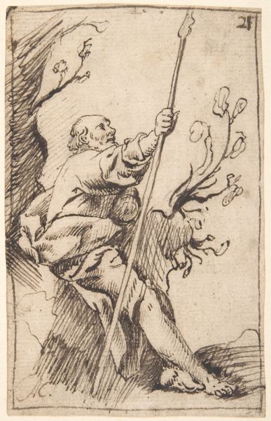Antonio del Castillo y Saavedra rendered this intimate pen and brown ink drawing, titled "Figure of St. Andrew seated in a Landscape." The composition emphasizes the figure’s connection to the natural world, showing St. Andrew seated beneath a tree, his form merging with the landscape. Notice the fluid and dynamic linework that defines the forms, from the gnarled branches of the tree to the drapery enveloping the saint. The pen strokes vary in weight, creating a sense of depth and texture that draws the viewer into the scene. The artist utilizes a limited tonal range, achieving contrast through the density of the hatching and cross-hatching. This technique not only models the forms but also conveys a sense of atmosphere and light. The rough texture of the drawing, created by the artist's hand, gives it an immediacy and a raw quality. This work destabilizes the conventional representation of religious figures by placing St. Andrew in an unassuming, natural setting. It reflects broader artistic concerns about the relationship between humanity and nature, inviting ongoing interpretation.