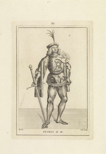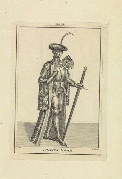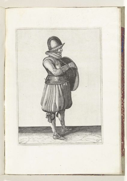Editor: Here we have Ferando Bertelli's "Italian Courier," an engraving from 1569 residing in the Rijksmuseum. The detail achieved with just line work is incredible. He seems weighted down, almost burdened by the textures, patterns and objects he carries. What can you tell me about the form and composition? Curator: Note how Bertelli meticulously renders each element – the textures of the courier's clothing, the precise lines defining his posture. These aren't just descriptive; they articulate meaning. The composition presents a study of contained shapes and directional forces, carefully considered for both harmony and controlled tension. Do you perceive any specific compositional rhythms here? Editor: Well, there is a slight diagonal running from the top left to the bottom right, giving it a forward motion… his stance contributes too. It feels like an exercise in balancing shapes – the fullness of his breeches against the tautness of his sword. Curator: Precisely. The spatial relationships between these forms, and even the very line quality contribute to the dynamism. The engraving rewards slow looking and is intended to function on a purely visual level. We understand it by decoding its formal structures, allowing the art itself to communicate. The medium itself – engraving – reinforces these precise elements, wouldn't you agree? Editor: Absolutely. It's fascinating how the artist controls the viewer's eye simply through line and form. Thanks! Curator: My pleasure. Paying attention to how shapes, textures and movement work in an image unlocks a deeper connection to art, regardless of the subject it may be depicting.