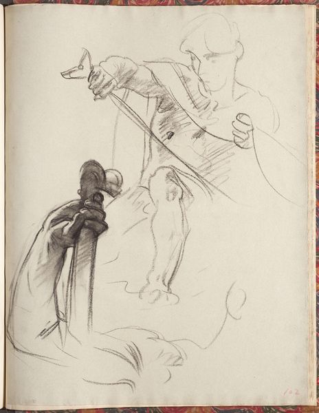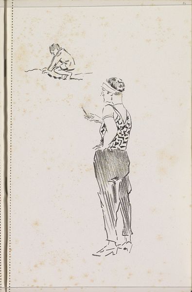 Editor: Here we have Carel Adolph Lion Cachet’s “Figuurstudie,” a drawing created sometime between 1874 and 1945. It has the appearance of a quick sketch, focusing on two figures. The mood is rather subdued, almost secretive. What draws your eye in this piece? Curator: It's the enduring power of implied narrative, isn't it? Look at how Cachet uses minimal lines to suggest character. The woman in the foreground, partially obscured, yet dominating the composition – what stories does her stance evoke? Who do we imagine her to be? Her clothes immediately made me think of older archetypes like Victorian England. Do you think Cachet has cleverly used the figure in the background to elicit those reactions? Editor: I hadn't considered the specific era, but now I see it! The other figure is less defined, almost ghostly. Is this contrast intentional, do you think? Curator: I suspect it’s a device for guiding our focus. The sharper lines denote a psychological weight on the foreground figure, creating an atmosphere, but one dependent on the other. Both are locked within that sketchbook page - where every line holds potential and history. Have you considered the possible social connection between the two? Mother and son? Or is she someone waiting on the seated man. The lack of resolution invites an engagement with visual storytelling. Editor: That's a great point. It feels like Cachet provides just enough information for our minds to fill in the gaps and it invites you to dream up your own theories as to the relationship between these figures. Curator: Precisely. It prompts us to project our own experiences and understanding of visual shorthand onto it, doesn't it? Consider what this means – how does the cultural memory shape what is shown on display in order to engage modern audiences. What if we saw this same picture one-hundred years ago. Editor: This piece reveals how much we bring to the act of viewing. I came in with very little knowledge, but through conversation, I am able to understand this in a new context! Curator: I, too, enjoyed our little excavation! It’s fascinating to see how a simple sketch can be so layered, reflecting the artist’s and the viewer's world.