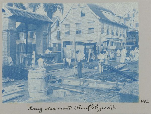 Hendrik Doijer captured this cyanotype print, "Opzichter Nieuwenhuis bij brug Knuffelsgracht", sometime between 1863 and 1925. The photograph shows the construction of the "Knuffelsgracht" bridge. What stories does this particular image tell us about its historical period? The cyanotype process itself offers a clue; it was often used for technical drawings and architectural plans, marking this as a documentary image rather than a fine art print. Moreover, the image is inscribed with Dutch text, perhaps indicating the location in the former Dutch colony of Suriname. We can consider how the construction of infrastructure projects intersected with colonial power dynamics. Who was the "Opzichter Nieuwenhuis," and what role did he play in this project? What can the picture tell us about the labor force used for the bridge construction? Historians can piece together the social and economic context of Doijer's photograph, using archives of colonial records, engineering documents, and even demographic data to understand its broader meaning.