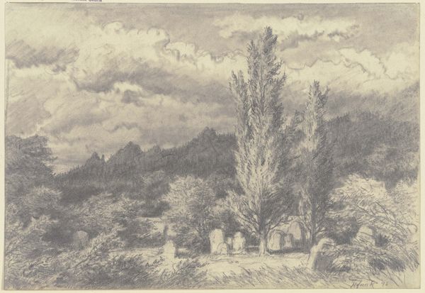 Editor: Here we have Jan Striening's "Landschap met boerderij omgeven door bomen," thought to be made sometime between 1866 and 1868. It's a watercolor, giving it this gentle, almost ethereal feel. What strikes me most is how…ordinary it seems, and yet, so peaceful. What do you see when you look at it? Curator: It's intriguing how Striening chooses such a seemingly unremarkable scene. The value lies in the materiality and method of production. Consider the choice of watercolor: a portable medium, enabling plein-air execution, aligning with the growing accessibility of art materials and leisure time for the burgeoning middle class. It speaks volumes about shifting social structures and art production, doesn’t it? Editor: It does. It’s like, this isn’t some grand historical painting; it's someone’s house! So the availability of materials is allowing people to…document their everyday? Curator: Exactly! Think about the production of paper and pigments during this period. The rise of industrialization meant these materials became cheaper, allowing more people, not just the wealthy elite, to create and consume art. It blurs the line between "high art" and…a form of visual journaling, a record of everyday life and the landscape being actively consumed. How does that shift your perspective on the scene itself? Editor: It makes it feel almost radical. Not radical in a loud way, but…democratizing. Like art is becoming something everyone can participate in, not just observe from afar. I hadn't really thought about it in terms of the economy of art making before. Curator: Precisely. By examining the material conditions and means of production, we uncover how seemingly simple landscapes are deeply embedded in social and economic transformations. Editor: I'll never look at a landscape watercolor the same way again. I was so focused on the visual that I almost missed the story the materials themselves tell!