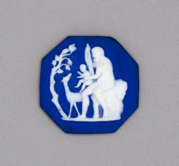 Curator: This is an intaglio depicting the figure of Justice, made by the Wedgwood Manufactory around the late 18th century. It’s crafted from ceramic in a relief style. What strikes you about it? Editor: Well, immediately I'm caught by the stark contrast – the inky black figure against that delicate periwinkle blue background. It gives it this sort of… cameo-like vibe, almost melancholic despite the subject being Justice. And such crispness! Curator: The Wedgwood Manufactory became famous for pieces precisely like this, embracing Neoclassicism to revive interest in classical themes. Intaglios like these would have circulated as luxury items, popular among collectors and those keen to align themselves with classical virtue. Editor: Luxury items about virtue, haha. Is that always the real virtue behind owning luxury items? Seriously, though, the composition is clever – this almost zen balance achieved just by the scales. Curator: Absolutely. Justice as an allegorical figure dates back millennia. Depicting her with scales became common in the 15th century, the image an allusion to impartiality, rationality, and due process. The piece likely served to broadcast the owner's supposed ethical grounding. Editor: She's got that laurel wreath, too. Looks comfy where she sits with it… Like justice earned or perhaps even purchased. Is this less about true justice and more about the performative kind? And this ceramic – its relative affordability and production speed must have surely factored in here. Curator: Undoubtedly. By using the ceramic technique, Wedgwood was able to bring this style and ideal to a larger audience, popularizing the classical ideal on a broad scale, while retaining some measure of exclusivity, as you noted. It's fascinating how they leveraged both exclusivity and popular appeal to create this niche. Editor: So it’s an artistic mass production in disguise… interesting indeed. This object encapsulates a tension between aspiration and reality that I still see in our contemporary world. Maybe that’s why it’s still intriguing centuries later. Curator: A tension still so very relevant in how we talk about institutions. So very good to think with! Editor: Here's to Justice still sitting on the shelf... and to thinking well, or just thinking out loud at all.