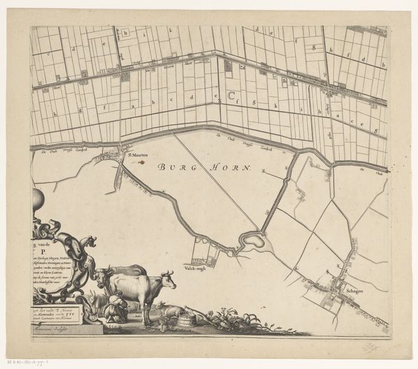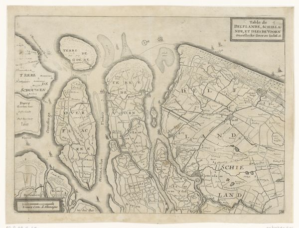 Curator: This engaging work is entitled "Kaart van de grietenij Barradeel," a map created sometime between 1698 and 1718 by an anonymous artist, employing the techniques of drawing and engraving in ink on paper. Editor: It gives such an incredible sense of place, even though it is so long ago. I am struck by how utilitarian yet ornate the piece is – almost decorative. Curator: Indeed, the combination of functionality and aesthetic appeal is a key element of cartography from this period. Mapping at this time was commissioned and displayed, asserting civic pride as well as offering utility. Consider too, the labor and expertise that goes into creating such detailed imagery—surveying, engraving, printing... Editor: And how would this have been circulated, displayed? Was it strictly a civic endeavor, tied to government and institutions? Did the artisan cartographers who created such images ever attain any social recognition or wealth, or where they relegated as craftsmen instead of “artists”? Curator: It likely would have been commissioned by the local government, intended for display in council chambers or the homes of wealthy landowners. These artisans held respected, skilled positions. Think about their workshops, the apprentices learning the craft… This speaks to a sophisticated network of knowledge transfer and production. And, paper and ink in themselves were valuable commodities. Editor: Looking closer, it feels like two distinct halves fighting for dominance, with decorative elements like cherubs and elaborate cartouches vying for attention with functional, practical land divisions. One aspect speaks to art, and another to commerce, power, and a sense of ownership of this place. Curator: I think your point hits at a cultural intersection of practicality and display of wealth through skilled artisanry, deeply embedded in the social and institutional fabric. Editor: Ultimately, both the production of this object and the land itself, shown so meticulously, serve a specific function, reflecting very human activities and their context. I appreciate seeing the overlap. Curator: Precisely, observing how practical craftsmanship intersects with societal structures highlights both the value of tangible skill and the pervasive reach of power, which resonates still today.
