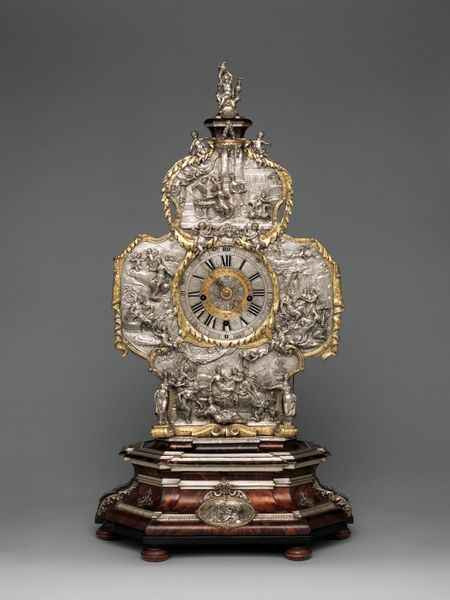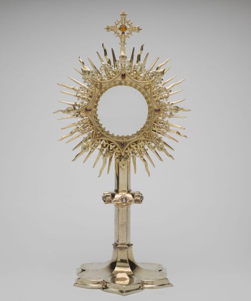 Editor: Here we have Diego de Atienza's Monstrance, crafted between 1646 and 1649, made of gold and silver. The metalwork is striking and creates an object that demands reverence. What sort of meanings radiate from this work for you? Curator: The Monstrance immediately evokes the sun – a universal symbol of divinity, radiating power and enlightenment. Look closely; consider the cultural memory embedded in such forms. Do you see how the radiating spokes also echo a halo, instantly associating it with holiness and sanctity? Editor: Yes, the halo effect is unmistakable! Is it intended to amplify the sacred host placed within? Curator: Precisely. It acts as both a container and a magnifier of spiritual energy. Notice the Baroque style with its elaborate ornamentation. Every flourish and curve is designed to overwhelm the senses, pulling the viewer into a state of religious ecstasy. Editor: I see what you mean! I’m also struck by how the materials, gold and silver, enhance the feeling of preciousness. Curator: Materials speak volumes. Gold, associated with the divine and celestial, contrasts with silver, which has lunar associations and is often linked to purity and reflection. Consider what these associations might evoke in a viewer of the time. Editor: So the selection of these specific metals are important symbols? Curator: Exactly. And consider the artistry required to shape these metals into such intricate forms! It speaks of dedication, skill, and the community’s investment in its spiritual life. What emotions do you feel looking at the piece? Editor: Awe and reverence, definitely. But also a sense of immense wealth and power concentrated into one object. Curator: That tension between spiritual devotion and worldly power is something Baroque art often explores. These objects reflected the religious beliefs of the society at the time. Editor: It’s amazing to unpack so much meaning from what seems like a purely decorative object. I'll never look at religious art the same way. Curator: The power of an icon lies not just in its beauty, but in the complex web of cultural and psychological associations it embodies. I will make sure to note that for my paper!
