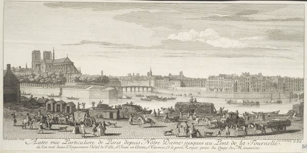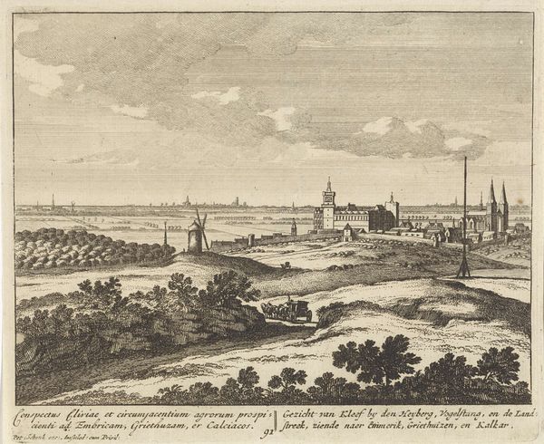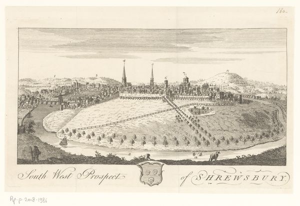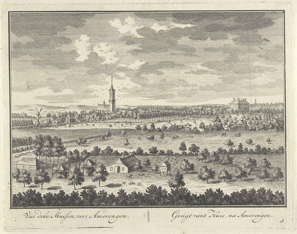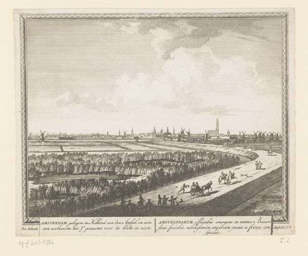 Curator: This serene cityscape is “Gezicht op Utrecht nabij de Leidse Rijn,” or “View of Utrecht near the Leidse Rijn,” an etching and engraving by Daniël Stopendaal from around 1790. What's your first impression? Editor: It strikes me as incredibly balanced. The composition leads my eye smoothly from the foreground details, the farmers and grazing sheep, to the detailed cityscape on the horizon and the sky above. It feels very classical. Curator: Yes, there’s definitely a sense of order and control. Stopendaal offers a particular view of urban space here, mediating the city through the lens of agriculture and rural labor. Note how he inscribes the skyline, a pictorial shorthand to designate each building for its respective church, to call it into a civic totality. It's an assertion of bourgeois authority over the landscape. Editor: Exactly. See how the sharp lines of the architecture contrast with the softer, almost idealized curves of the figures in the foreground? Stopendaal juxtaposes man with his own artificial construction. Curator: That artificial construction being a space of religious and governmental authority in 18th century Dutch society, which Stopendaal subtly implies with the various church steeples represented in line. The image, which shows both Dutch and Latin textual descriptions of the space, emphasizes Utrecht’s position as an intersection of civic importance. Editor: I’m also drawn to the use of light and shadow. It creates depth but in a highly structured way, not chaotic, and in turn guides you into a visual conversation that shows great perspectival rigor. You’ll notice how different sets of shading are applied to the rows of cultivated shrubbery, differentiating the grounds while also giving us insight into how to scan the image overall. Curator: Absolutely. Stopendaal's precise draftsmanship mirrors the Enlightenment's emphasis on rationality and empirical observation, but this print was likely disseminated widely, not just to those educated in these schools of thought. This view of Utrecht, reproduced and distributed, served to define a sense of place, a collective identity. Editor: For me, this meticulous rendering reflects the period's intense interest in representing the physical world with ever-increasing precision—almost as a way to capture and classify reality itself. Curator: Perhaps these landscapes offer their 18th-century audiences an emergent vision of the public, both its possibilities and power. Editor: What a captivating convergence of art and context. Curator: It certainly highlights the intricate layers that constitute even seemingly simple landscape prints.
