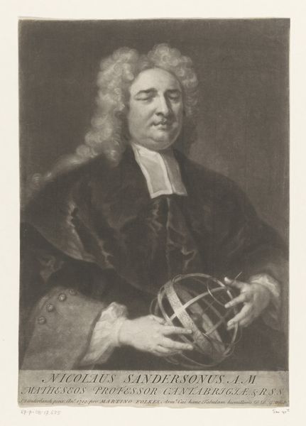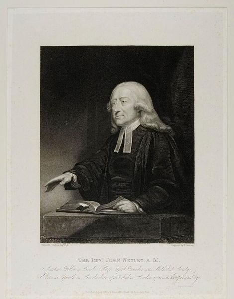 Curator: Edward Fisher executed this print of William Markham sometime between 1759 and 1782. Editor: The composition feels very deliberate, almost staged, in the way it utilizes a monochromatic palette. It conveys a certain gravitas befitting the subject's apparent stature. Curator: Absolutely. Fisher’s background in academic art shines through. Note how the choice of rendering Markham's image through print rather than paint subtly democratizes his representation, making it accessible to a wider audience. It echoes a shift in the consumption of imagery and power during that era. Editor: And the book he holds reinforces this image of scholarly authority and moral fortitude. Its symbolism is almost blatant: Markham as a pillar of wisdom. There is power in printed text, right there in his hand. Curator: Precisely. Markham served as Archbishop of York during a turbulent period. Fisher was probably making an argument about the Archbishop's worthiness via printed portraiture. The portrait functions less as a likeness and more as a calculated endorsement for political stability. Editor: It’s interesting how even a seemingly straightforward portrait engages in its own form of public rhetoric. It gives us much to read between the lines about 18th-century hierarchies. Curator: Indeed. When examining prints such as these, we unveil the societal currents that defined both the patron and the artist during periods of political shift and image-making democratization. Editor: Analyzing artworks such as these prompts us to contemplate just how carefully images were constructed to perform specific symbolic and social roles. It gives new resonance to how we view people, especially men of power, through portraiture.