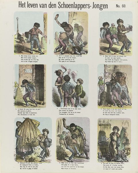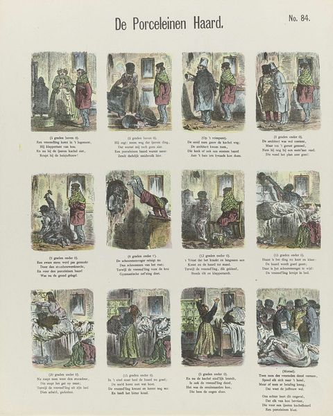 "In den Regentijd" is a print by De Ruyter & Meijer, whose dates are unknown. This illustrated sheet shows a series of vignettes depicting children's activities during a rainy day. The series provides a window into the cultural values and social expectations of childhood. Gender roles are subtly reinforced, with girls shown indoors engaged in domestic activities, while boys are depicted in more adventurous outdoor play. There is an emotional cadence as the children navigate disappointment, adaptation, and simple joys of indoor activities such as reading and playing with dolls. Note the poem accompanying each vignette; they provide a narrative to each scene. The print shapes childhood as a time of learning and moral development while subtly reinforcing societal norms through each child's actions. It also emphasizes how children emotionally and psychologically process their surroundings in a way that is accessible to people of all ages.