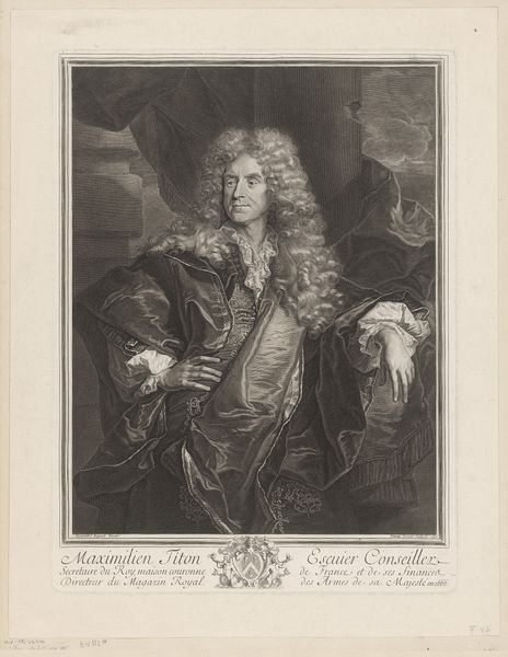 Curator: Well, hello there. This portrait from 1744 immediately speaks of formal elegance. The level of detail the engraver, Georg Friedrich Schmidt, achieved is quite remarkable. What is your first impression? Editor: It’s the wig, isn't it? An almost overwhelming cloud of cascading curls. But behind that elaborate facade, I sense a very particular individual trying to peek through. Almost guarded, even. Curator: You know, I always think of these commissioned portraits as public performances. Schmidt was portraying Pierre Mignard who was, importantly, First Painter to the King and Director of the Royal Academy of Painting and Sculpture. Think of the power dynamics involved. The visual language is carefully crafted. Editor: Absolutely, it's a performance. And Mignard is literally holding his tools in hand—a blank drawing board, a stylus... These symbols showcase Mignard’s role as a creator. Even his pose, caught mid-action, almost winks to a sense of spontaneous genius despite the constraints you just noted. Curator: I think you've identified a key point. Look at the architectural detailing behind him, the drape of the curtains – it all speaks to status and patronage. Everything is designed to convey Mignard's place within a hierarchy, while suggesting, maybe, he can transcend it. Editor: And consider the gaze itself. Those direct, almost penetrating eyes lock you in. There's a hint of shrewdness there, as if Mignard knows exactly the game he's playing with posterity. The Baroque flourishes signal artistic abundance, but his eyes carry such knowing weight. Curator: It is a game. And it makes us participants even now. As we view it in the Rijksmuseum today, are we reinforcing these structures, questioning them, or maybe something in between? That constant questioning, that’s history, I believe. Editor: Indeed, a portrait like this acts as a mirror reflecting not only Mignard's image but also our ever-shifting perceptions of power, artistry, and identity through history's symbolic hall. It truly persists.