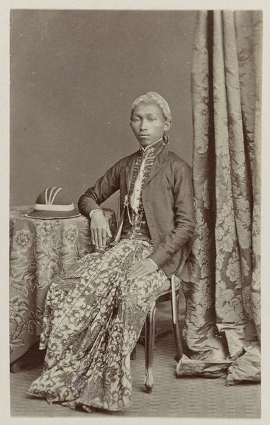 Curator: Here we have a rather stately portrait to contemplate. It's an albumen print made between 1868 and 1872 by Woodbury & Page. The work is entitled "Echtgenote Ratoe van Pakoe Boewono IX, Susuhunan van Surakarta," which translates to Wife of Pakubuwono IX, Susuhunan of Surakarta. Editor: There's such stillness, an almost heavy grace, in this image. The limited palette of tones accentuates that air of dignified formality, but underneath, a profound gravity radiates from her eyes. It almost feels less like a record and more like an encounter. Curator: Yes, the tonal range created through the albumen process contributes immensely to the sense of depth, making it nearly sculptural. Let’s look more closely at the structure here. We have a classic oval format that focuses intently on the sitter's controlled pose and regal garments. The composition follows a careful schema: the face centrally positioned, framed by ornate jewelry and dark fabric...it lends an impressive hierarchy. Editor: Exactly, and those repeating motifs of ornate embellishment—they remind us about this portrait's implicit purpose of showing status and belonging. Yet, I sense a personal story beyond representation. I find myself trying to meet the sitter’s gaze, almost seeking conversation, don't you? This tension is compelling. Curator: Indeed. We must remember, too, that works from this era frequently fall under the problematic umbrella of "Orientalism," the photographer being outside the subject’s lived experience, imbuing meaning through an external gaze. In this way, it mirrors, perhaps unintentionally, Academic Art’s propensity toward exoticization through precise renderings and staged aesthetics. Editor: Which means her own narrative gets diffused or refracted by these approaches? I can see that. So much complexity. Makes you think what stories photographs don't, or perhaps can’t, tell. Curator: Precisely. Each artwork is more than simply meets the eye; context and intention mingle—we’re reminded it requires continued questioning and empathy. Editor: Absolutely. It gives one much food for thought.