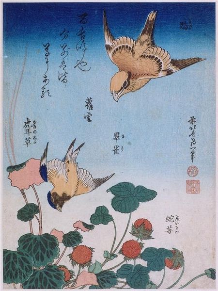 Curator: This is Utagawa Hiroshige’s woodblock print, "Flathead (Kochi) and Eggplants (Nasubi)," part of the series "A Shoal of Fishes." The print is currently in the Harvard Art Museums. Editor: I'm immediately struck by the odd juxtaposition of the fish with the eggplants. It’s unsettling, almost dreamlike. Curator: Hiroshige was working within a tradition of "catch-of-the-day" prints, popular among the merchant class. However, these prints transcended mere documentation. Editor: The eggplants, particularly, seem to carry symbolic weight. They're dark and heavy, contrasting with the fish's implied movement. Is there a deeper meaning there? Curator: The eggplant, or "nasu," could represent autumn or fruition, or even hint at themes of prosperity. Hiroshige often blended naturalism with cultural symbolism. Editor: It’s a fascinating example of how everyday objects become loaded with significance within a specific cultural context. Curator: Exactly, the seemingly simple composition reveals complex layers of meaning, reflecting the values and aspirations of its time.