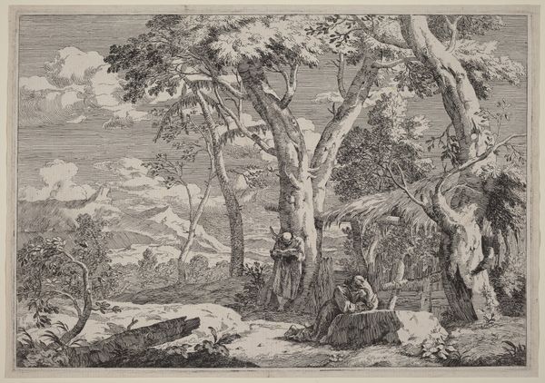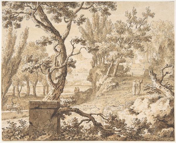 Curator: Immediately I’m drawn to the tranquil stillness. There’s a dreamlike quality, a soft melancholy hanging in the air, wouldn't you agree? Editor: I see what you mean. And it comes from the muted tones that dominate Johann Wilhelm Schirmer’s “Forest Landscape,” created around 1832. Let’s look closer at the use of ink and charcoal on this drawing and place the forest within the context of Romanticism. Curator: Absolutely, it is an important contextual step. Note how Schirmer renders this sylvan scene. See how nature takes precedence. We find a few geological oddities too – perhaps limestone karsts. And then the majestic tree dominating the left of the composition...it all coalesces into an emblem of Romantic-era nature worship. Editor: Indeed. The careful depiction of foliage – the reeds in the foreground, the tree’s heavy crown – speaks to Romanticism’s preoccupation with detail, inviting the viewer into nature's intricate web. I would hazard a guess and say that Schirmer is deliberately crafting a microcosm reflecting broader societal concerns: of humankind’s relationship with the natural world, the fragility of life in an increasingly industrialized world... Curator: A microcosm perhaps best epitomized by the watchful deer gazing out from the central, slightly raised clearing. What does this animal signify to you? Editor: For me, it’s loaded with symbolic weight – a guardian, a witness to nature’s undisturbed beauty. Its very presence transforms this tranquil scene into something sacred, protected. The forest as a sanctuary. Curator: Interesting you describe the deer in such reverent, protective terms. For me, the presence of that deer raises questions of access and exclusion: Who is allowed into this sacred space? Who defines the boundaries? And how do those definitions intersect with broader power structures related to class and land ownership in the early 19th century? Editor: That intersectional analysis deepens our appreciation of Schirmer's work, making "Forest Landscape" a timely commentary. Curator: Exactly. I'll now keep an eye out for the echoes and reflections between ecological concerns in Romanticism and today’s socio-political movements. Editor: And for my part, I’m freshly convinced that art like this contains codes and cultural traces, demanding of us deep analysis to unearth the treasures of meaning locked within.