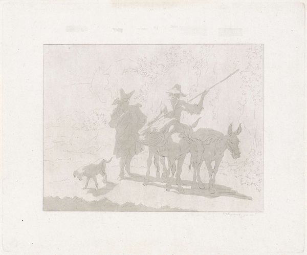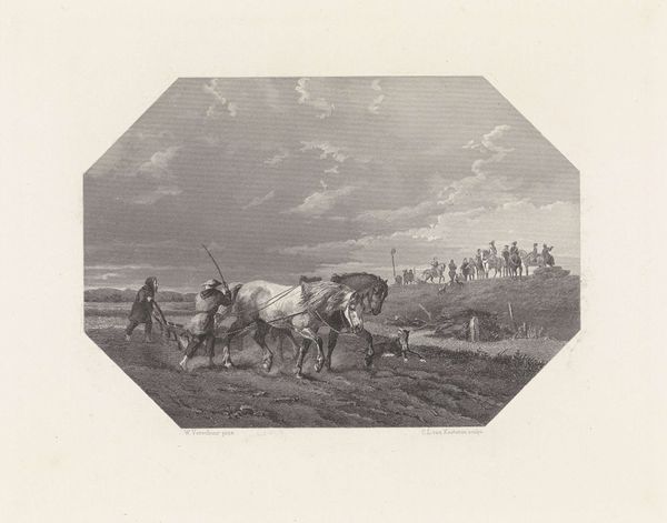 This is Charles Jacque’s etching, depicting a hunt, titled "Le passage d'un obstacle." The riders, the hounds, and the obstacle are all prominent symbols here. The hunt, deeply rooted in the historical context of aristocratic leisure, represents a complex interplay of power, tradition, and the taming of nature. Consider the recurring motif of the hunt throughout art history, from the ancient frescoes of aristocratic life to Renaissance tapestries and medieval bestiaries. The hunt evolved from a basic need for survival into a ritualized spectacle of dominance. The obstacle becomes a focal point, symbolizing the challenges overcome in the pursuit. The act of overcoming obstacles, be they physical barriers in a hunt or metaphorical hurdles in life, speaks to the human desire for conquest, the pursuit of knowledge, and the demonstration of control over oneself and the environment. This print captures not merely a scene of a hunt but a symbolic enactment of control and the cyclical, eternal drive to push beyond barriers, both real and imagined.