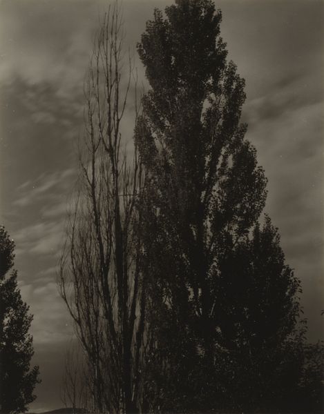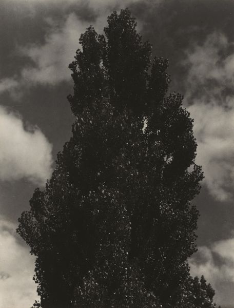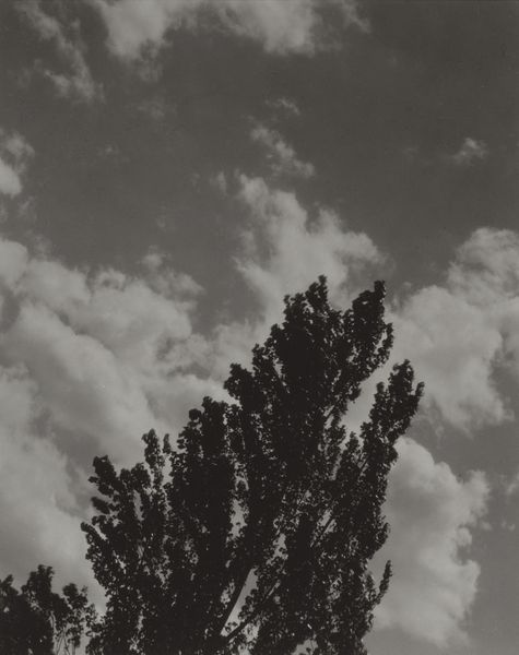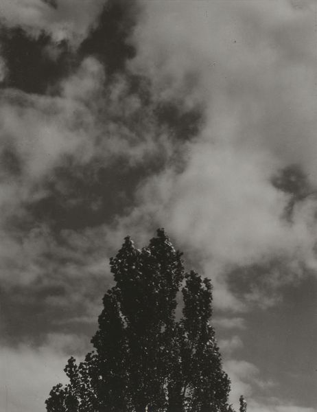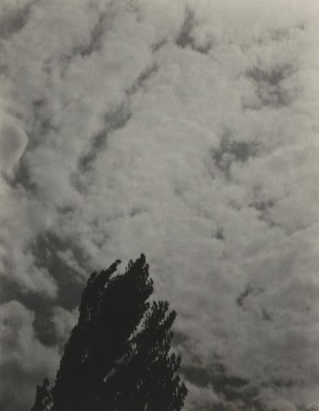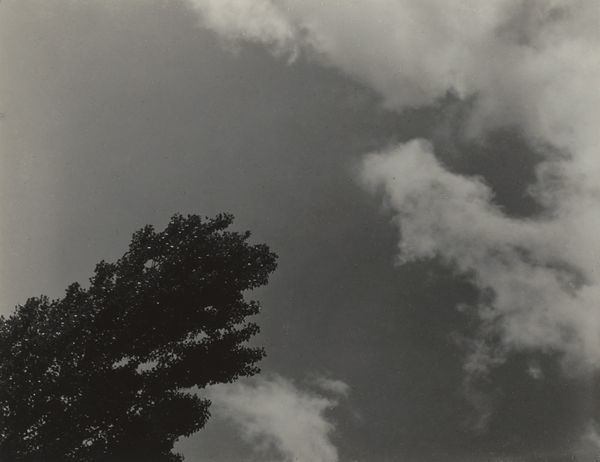 Curator: Alfred Stieglitz's 1923 photograph, "Portrait—K.N.R., No. 3 or Songs of the Sky C3," immediately strikes me as a study in contrasts, even beyond the obvious monochrome presentation. The dynamic range between dark foliage and radiant clouds evokes a unique emotional tone. Editor: It's interesting you focus on "emotional tone." To me, its power rests in its production, its gelatine-silver print offering us direct access to Stieglitz's method. This print, itself an object, manifests an interaction between photochemicals and light. That's where I see its charge. Curator: I understand what you mean about materiality—however, I think there's more than just physical presence at play. Consider how the contrasting tones and shapes in this landscape interact; this formal opposition is what evokes dynamism and sublimity, don’t you agree? Editor: I do. Stieglitz wasn't merely depicting "nature." His choices - gelatin silver, and a small-sized print—are about a new vision for photography as an artistic material that could stand apart from painting while embracing the mass reproduction made possible during the machine age. Curator: Well, the title itself—"Songs of the Sky"—lends itself to broader metaphorical reading. It suggests transcendence or spiritual reflection. And if you follow that thread, you understand Stieglitz was positioning himself within philosophical discourse. Editor: That transcendence has a basis. Photography provided a democratic medium and shifted visual culture. These images of the sky, reproducible for all, speak to labor in that they reflect not just his individual hand but also industrial processes: factories churning out chemicals, mass communications opening up this type of image-making. Curator: Ultimately, whether viewed through a formal or a material lens, this photograph provokes contemplation on nature's relationship to modern consciousness. Editor: Right. It allows for reflection upon both the artistry of rendering nature and the mechanics required to capture its image, to make it material and accessible to an audience.
