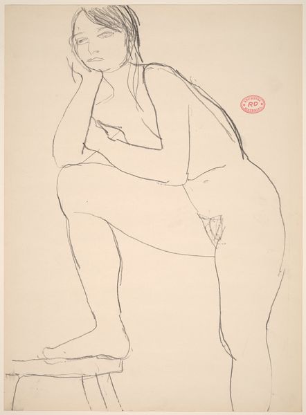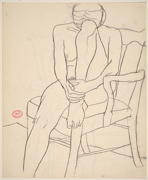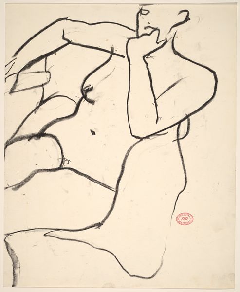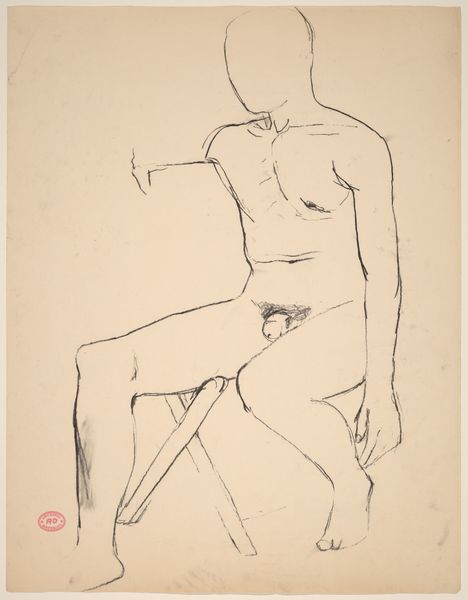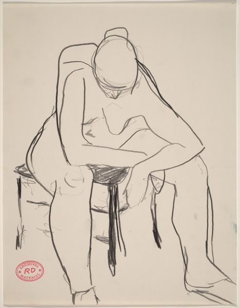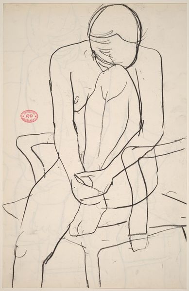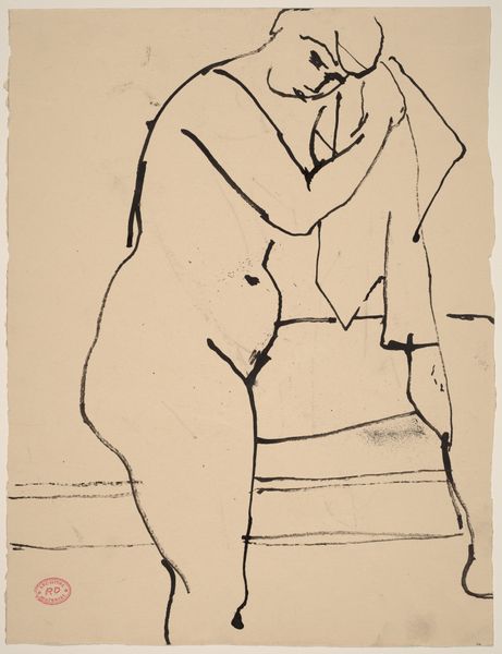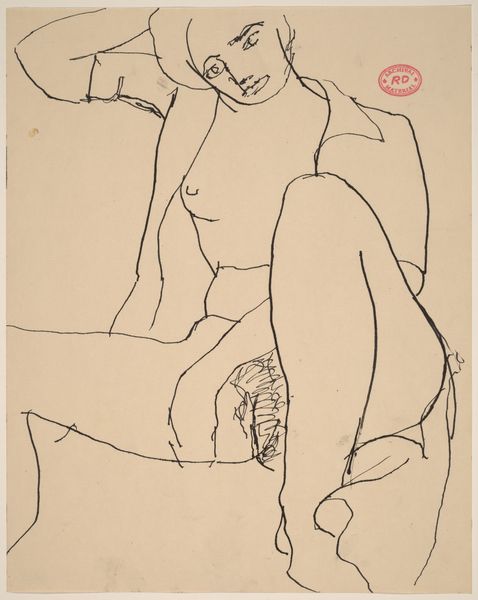 Editor: Richard Diebenkorn’s "Untitled [seated nude with coat draped over her shoulders]," likely created between 1955 and 1967, is rendered in ink. It presents itself rather starkly. Curator: Yes, the economy of line is quite striking. The sparest means are employed to delineate the figure, imbuing it with a contemplative mood, wouldn't you say? The subject is a nude, seated, partially concealed by a coat. Editor: Immediately, what I notice is the contrast. The stark lines define not just form, but also the process. The labor involved is apparent, a deliberate act of paring back. Curator: It is about more than the immediate subject. The negative space takes on a structural role. Each line delineates form, yet also speaks to absence—a key structural element contributing to the figure's pose and state of mind. Editor: And consider the ink itself. This isn’t about illusionism or perfection. It's about direct, unmediated marks—almost like a map charting a journey through form and the material constraints of ink and paper. The lack of shading or color directs attention squarely to this materiality. Curator: Precisely. By forgoing traditional modelling, Diebenkorn emphasizes line as a pure signifier, a framework of its own construction. The figure is both revealed and concealed, provoking questions about representation and interpretation. Editor: Looking closer at the figure, the casual drape of the coat suggests an intimacy that's not voyeuristic. There’s something immediate in that portrayal, which comes across due to Diebenkorn’s clear and transparent process. It does away with notions of artistic genius and focuses on the art and the act of doing. Curator: I agree that this piece emphasizes process as an important means, a technique used in many academic institutions. And yet, it's clear that the work’s structural organization guides the viewer to ask, 'How do line and form collaborate to construct the observed?' A query as relevant to Diebenkorn’s time as it remains now. Editor: The beauty lies in this honesty, doesn’t it? There are no hidden layers, no pretense. We see the decisions, the hand, the labor—a beautiful tension in its simple form. Curator: Ultimately, this exploration shows the capacity of the artist's hand in shaping both perception and discourse around form, labor, and materiality.