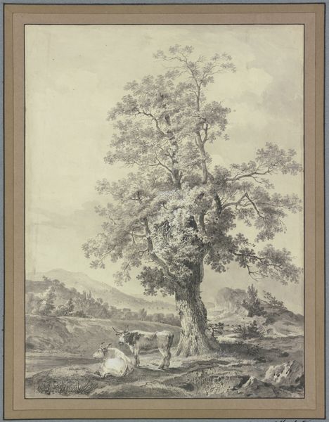 Curator: Ah, a pastoral scene rendered with a surprising lightness of touch. What are your initial impressions? Editor: It feels very contained, doesn’t it? Quite tranquil, but also...a little monotonous, all those gray washes. Curator: The artist here is Franz Kobell, and we believe this drawing, entitled "Landschaft mit Herde und Hirten," or "Landscape with Herd and Shepherds," was made sometime in the 18th century. Kobell used pencil and ink to build up the composition. It is presently housed in the Städel Museum collection. I'm curious, do you find the monochromatic palette restrictive or illuminating in any way? Editor: Well, I think the limitations drive him to focus on texture. Look at how he distinguishes the foliage from the animals purely through varying his strokes and washes. The paper becomes so important—it's not just a support; it *is* the light in this picture. The relative absorbency of the paper really dictates the tonal range. Curator: Exactly. The paper itself seems almost to absorb and reflect the idealized Arcadian values of the era. Note how the figures are positioned right in the middle, at the fulcrum of the composition, enjoying leisure, overseeing their animals. It almost presents an aspirational balance between man and nature, which must have resonated at the time, even amidst emerging industrialization. Editor: Yes, but this idyll is *made*. It's the result of conscious artistic choices with very particular materials. Even the ink, depending on its source and preparation, carries a social history with it—labor, trade, global flows. Curator: Fascinating how seemingly simple choices can be imbued with such layered meaning. I find myself meditating on the way that Kobell manages to depict such depth using only grayscale, like a memory fading gently through time. Editor: And I'm left contemplating the artist's hand, meticulously layering these washes, shaping a vision rooted not only in observation, but in the transformative properties of materials.